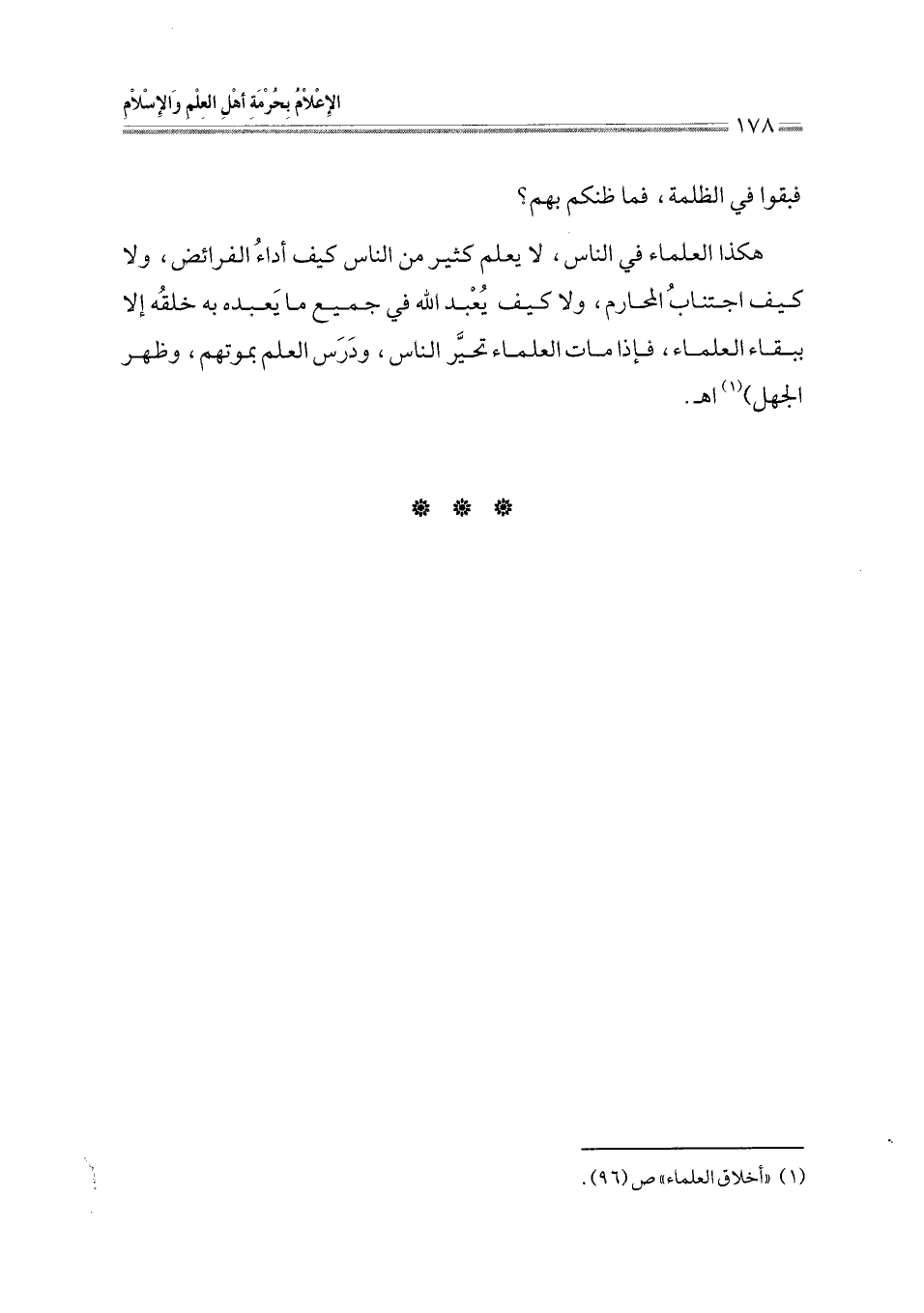 هكذا العلماء في الناس، لا يعلم كثير من الناس كيف أداءُ الفرائض، ولا كيف اجتنابُ المحارم، ولا كيف يُعْبد الله في جميع ما يَعبده به خلقُه إلا ببقاء العلماء، فإذا مات العلماء تحيَّر الناس، ودَوَس العلم بموتهم، وظهر الجهل) (¬1) اهـ.