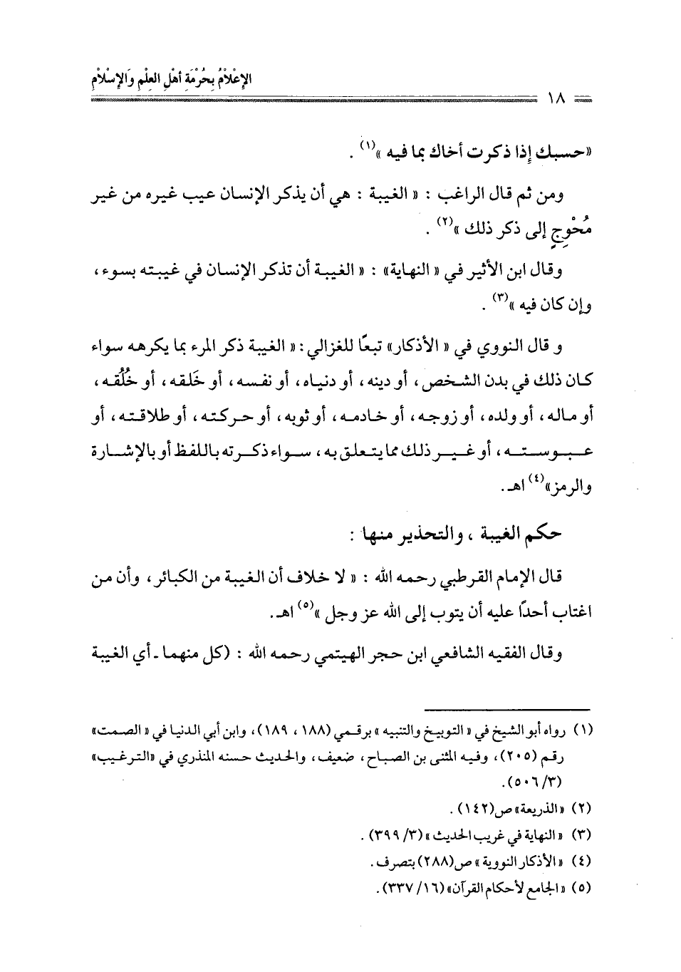 وقال الفقيه الشافعي ابن حجر الهيتمي رحمه الله: (كل منهما -أي الغيبة