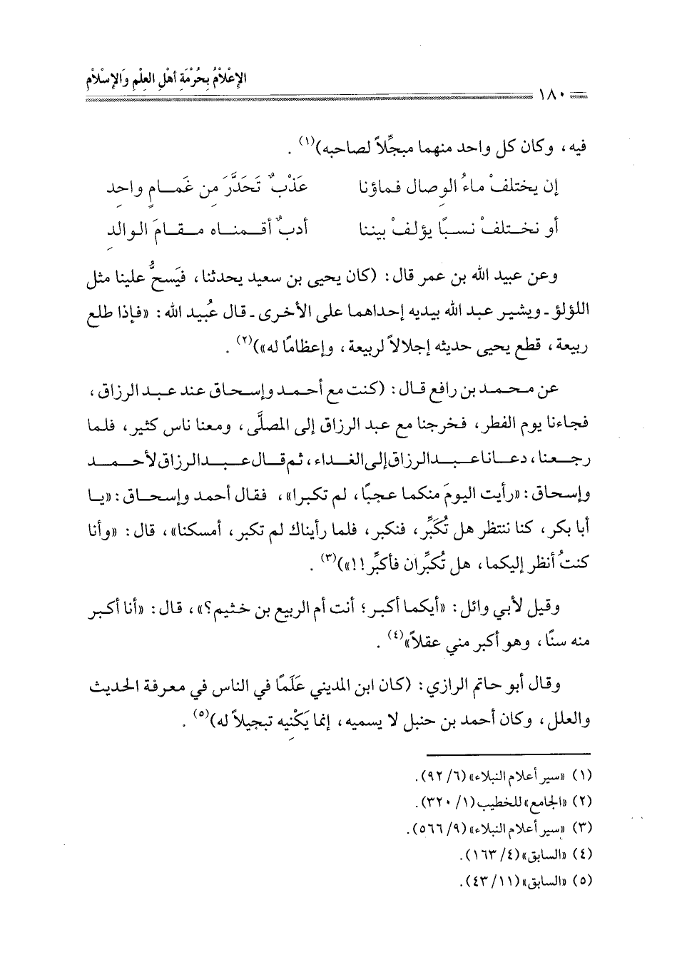 عن محمد بن رافع قال: (كنت مع أحمد وإسحاق عند عبد الرزاق، فجاءنا يوم الفطر، فخرجنا مع عبد الرزاق إلى المصلَّى، ومعنا ناس كثير، فلما رجعنا، دعانا عبد الرزاق الي الغداء، ثم قال عبد الرزاق لأحمد وإسحاق: " رأيت اليومَ منكما عجبًا، لم تكبرا "، فقال أحمد وإسحاق: " يا أبا بكر، كنا ننتظر هل تكبر، فنكبر، فلما رأيناك لم تكبر، أمسكنا "، قال: " وأنا كنت أنظر إليكما، هل تكبِّران فأكبر!! ") (¬3).
