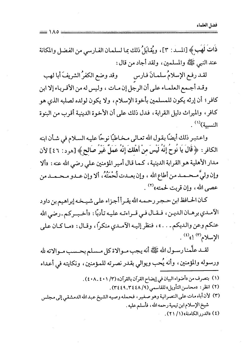 ذَاتَ لَهَبٍ} [المسد: 3]، ويُقابَلُ ذلك بما لسلمان الفارسي من الفضل والمكانة عند النبي - صلى الله عليه وسلم - والمسلمين، ولقد أجاد من قال: