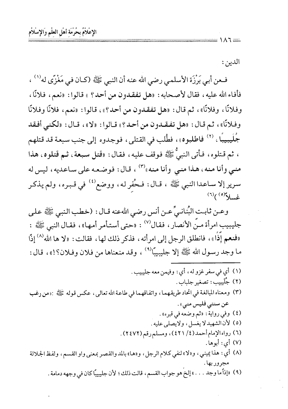 فعن أبي بَرْزَة الأسلمي رضي الله عنه أن النبي - صلى الله عليه وسلم - (كان في مَغْزًى له (¬1)، فأفاء الله عليه، فقال لأصحابه: " هل تفقدون من أحد؟ " قالوا: " نعم، فلانًا، وفلانًا، وفلانًا "، ثم قال: " هل تفقدون من أحد؟ "، قالوا: " نعم، فلانًا وفلانًا وفلانًا "، ثم قال: " هل تفقدون من أحد؟ " قالوا: " لا "، قال: " لكني أفقد جُلَيبيبًا، (¬2) فاطلبوه "، فطُلب في القتلى، فوجدوه إلى جنب سبعة قد قتلهم، ثم قتلوه، فأتى النبيُّ - صلى الله عليه وسلم - فوقف عليه، فقال: " قتل سبعة، ثم قتلوه، هذا مني وأنا منه، هذا مني وأنا منه " (¬3)، قال: فوضعه على ساعديه، ليس له سرير إلا ساعدا النبي - صلى الله عليه وسلم -، قال: فحفر له، ووضع (¬4) في قبره، ولم يذكر غسلاً (¬5)) (¬6).