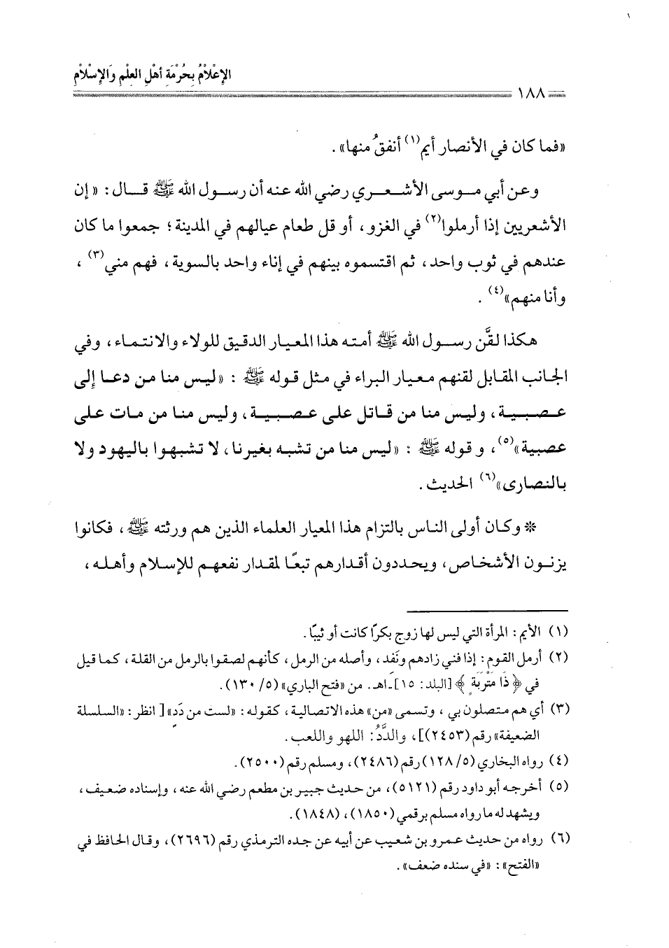 هكذا لقَّن رسول الله - صلى الله عليه وسلم - أمته هذا المعيار الدقيق للولاء والانتماء، وفي الجانب المقابل لقنهم معيار البراء في مثل قوله - صلى الله عليه وسلم -: " ليس منا من دعا إِلى عصبية، وليس منا من قاتل على عصبية، وليس منا من مات على عصبية " (¬5)، وقوله - صلى الله عليه وسلم -: " ليس منا من تشبه بغيرنا، لا تشبهوا باليهود ولا بالنصارى " (¬6) الحديث.