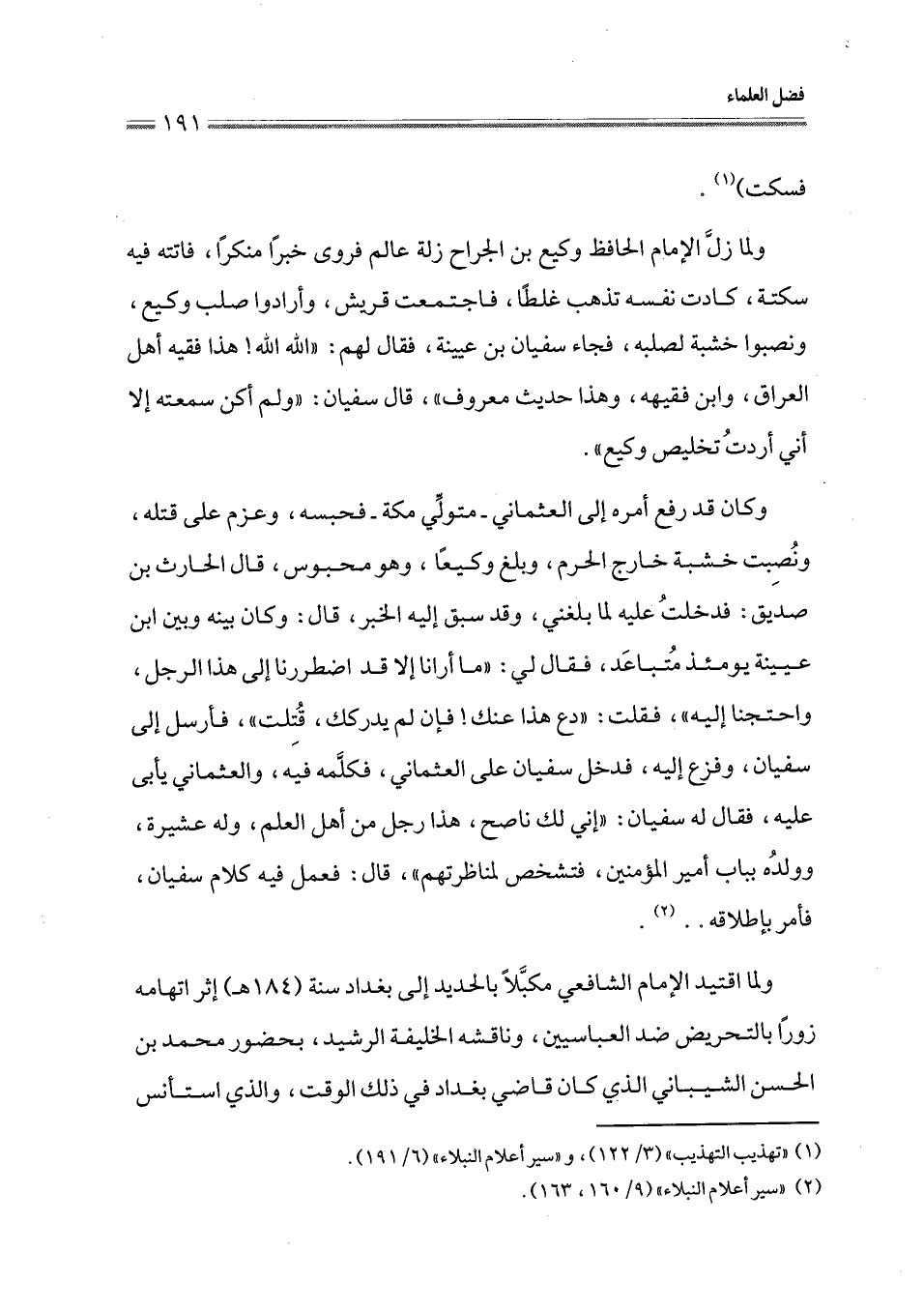وكان قد رفع أمره إلى العثماني -متولّي مكة- فحبسه، وعزم على قتله، ونُصِبت خشبة خارج الحرم، وبلغ وكيعًا، وهو محبوس، قال الحارث بن صديق: فدخلتُ عليه لما بلغني، وقد سبق إليه الخبر، قال: وكان بينه وبين ابن عيينة يومئذ مُتباعَد، مقال لي: " ما أرانا إلا قد اضطررنا إلى هذا الرجل، واحتجنا إليه "، فقلت: " دع هذا عنك! فإن لم يدركك، قُتِلت "، فأرسل إلى سفيان، وفزع إليه، فدخل سفيان على العثماني، فكلَّمه فيه، والعثماني يأبى عليه، فقال له سفيان: " إني لك ناصح، هذا رجل من أهل العلم، وله عشيرة، وولدُه بباب أمير المؤمنين، فتشخص لمناظرتهم "، قال: فعمل فيه كلام سفيان، فأمر إطلاقه ..... (¬2).
