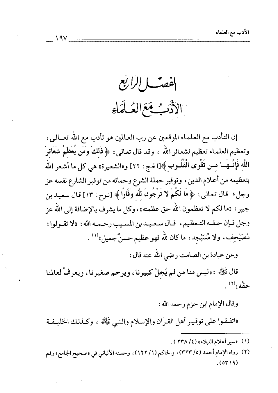 إن التأدب مع العلماء الموقعين عن رب العالمين هو تأدب مع الله تعالى، وتعظيم العلماء تعظيم لشعائر الله، وقد قال تعالى: {ذَلِكَ وَمَنْ يُعَظِّمْ شَعَائِرَ اللَّهِ فَإِنَّهَا مِنْ تَقْوَى الْقُلُوبِ (32)} [الحج: 32] و " الشعيرة " هي كل ما أشعر الله بتعظيمه من أعلام الدين، وتوقير حملة الشرع وحماته من توقير الشارع نفسه عز وجل؛ قال تعالى: {مَا لَكُمْ لَا تَرْجُونَ لِلَّهِ وَقَارًا} [نوح: 13]، قال سعيد بن جبير: " ما لكم لا تعظمون الله حق عظمته "، وكل ما يشرف بالإضافة إلى الله عز وجل فإن حقه التعظيم، قال سعيد بن المسيب رحمه الله: " لا تقولوا: مُصَيْحِف، ولا مُسَيْجِد، ما كان لله فهو عظيم حسنٌ جميل " (¬1).