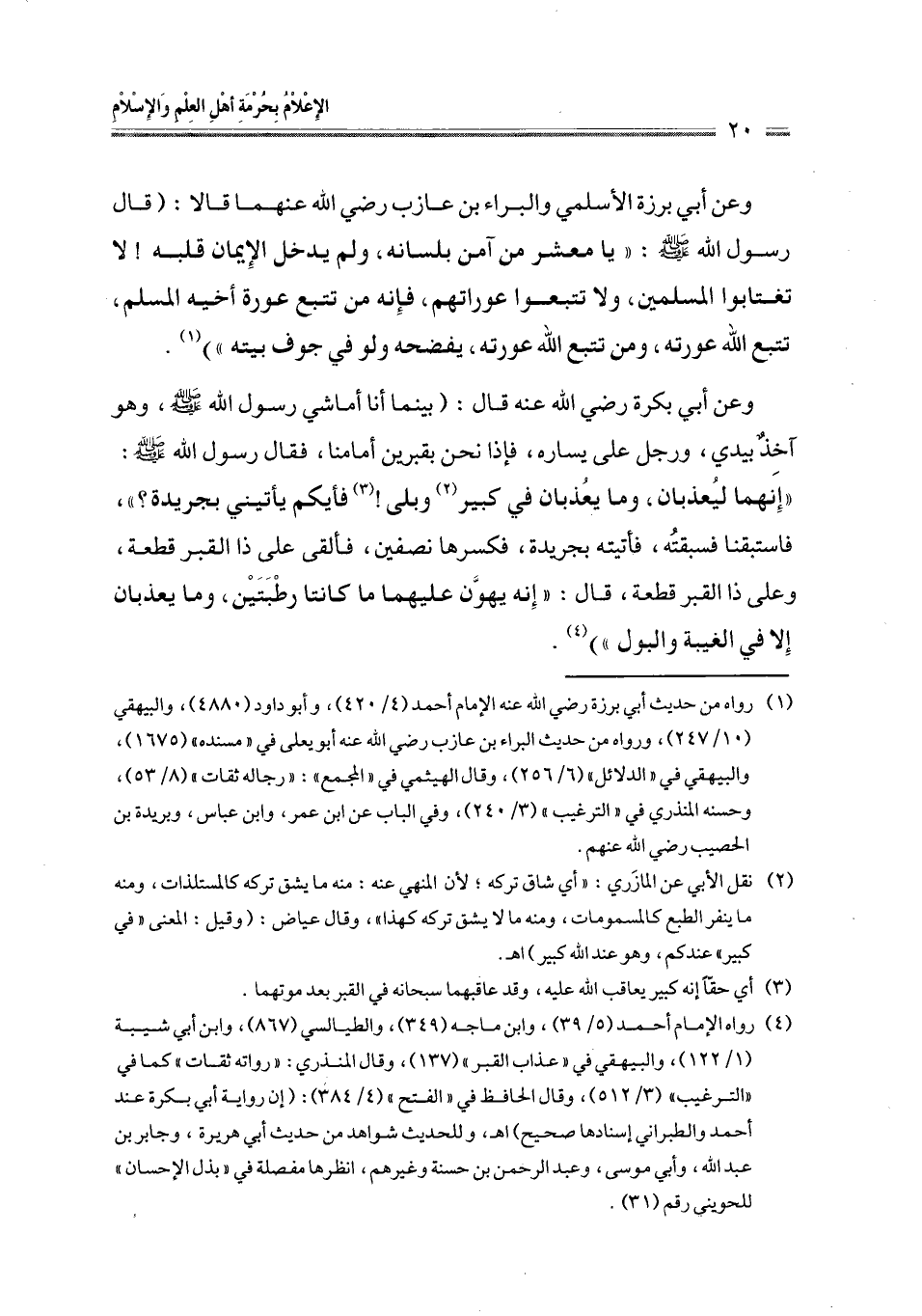 (¬4) رواه الامام أحمد (5/ 39)، وابن ماجه (349)، والطيالسي (867)، وابن أبي شيبة (1/ 122)، والبيهقي في " عذاب القبر " (137)، وقال المنذري: " رواته ثقات " كما في " الترغيب " (3/ 512)، وقال الحافظ في " الفتح " (4/ 384): (إن رواية أبي بكرة عند أحمد والطبراني إسنادها صحيح) اهـ، وللحديث شواهد من حديث أبي هريرة، وجابر بن عبد الله، وأبي موسى، وعبد الرحمن بن حسنة وغيرهم، انظرها مفصلة في " بذل الإحسان " للحوينى رقم (31).