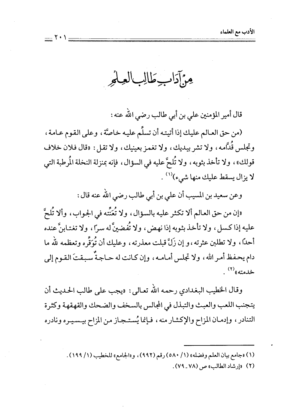 " إن من حق العالم ألا تكثر عليه بالسؤال، ولا تُعَنّته في الجواب، وألا تُلحَّ عليه إذا كسل، ولا تأخذ بثوبه إذا نهض، ولا تُفضين له سرًا، ولا تغتابن عنده أحدًا، ولا تطلبن عثرته، وإن زَلَّ قبلت معذرته، وعليك أن تُوَقِّره وتعظمه لله ما دام يحفظ أمر الله، ولا تجلس أمامه، وإن كانت له حاجة سبقتَ القوم إلى خدمته " (¬2).
