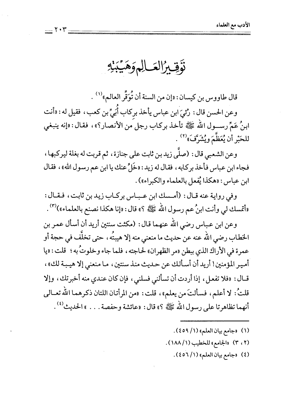 وعن الشعبي قال: (صلَّى زيد بن ثابت على جنازة، ثم قربت له بغلة ليركبها، فجاء ابن عباس فأخذ بركابه، فقال له زيد: " خَلِّ عنك يا ابن عم رسول الله "، فقال ابن عباس: " هكذا يُفعل بالعلماء والكبراء ").