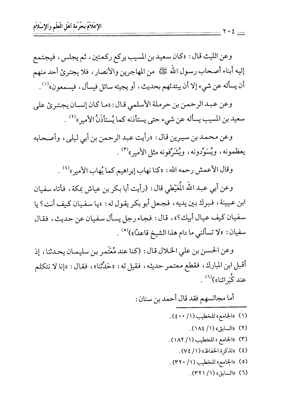 وعن عبد الرحمن بن حرملة الأسلمي قال: " ما كان إنسان يجترئ على سعيد بن المسيب يسأله عن شيء حتى يستأذنه كما يُستأذَنُ الأمير " (¬2).
