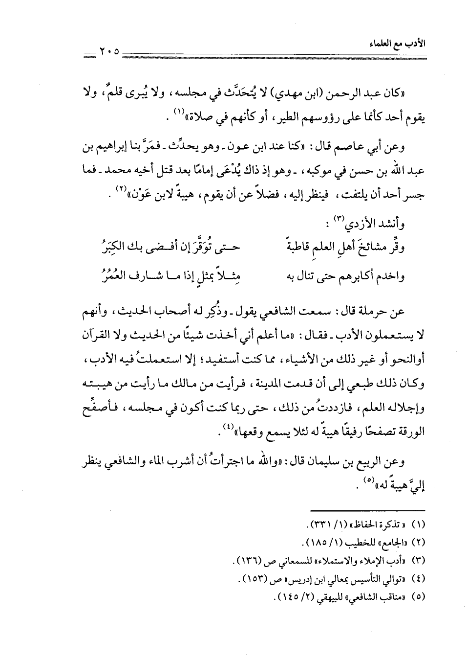 عن حرملة قال: سمعت الشافعي يقول -وذُكر له أصحاب الحديث، وأنهم لا يستعملون الأدب- فقال: " ما أعلم أني أخذت شيئًا من الحديث ولا القرآن أو النحو أو غير ذلك من الأشياء، مما كنت أستفيد؛ إلا استعملتُ فيه الأدب، وكان ذلك طبعي إلى أن قدمت المدينة، فرأيت من مالك ما رأيت من هيبته وإجلاله العلم، فازددتُ من ذلك، حتى ربما كنت أكون في مجلسه، فأصفِّح الورقة تصفحًا رفيقًا هيبةً له لئلا يسمع وقعها " (¬4).