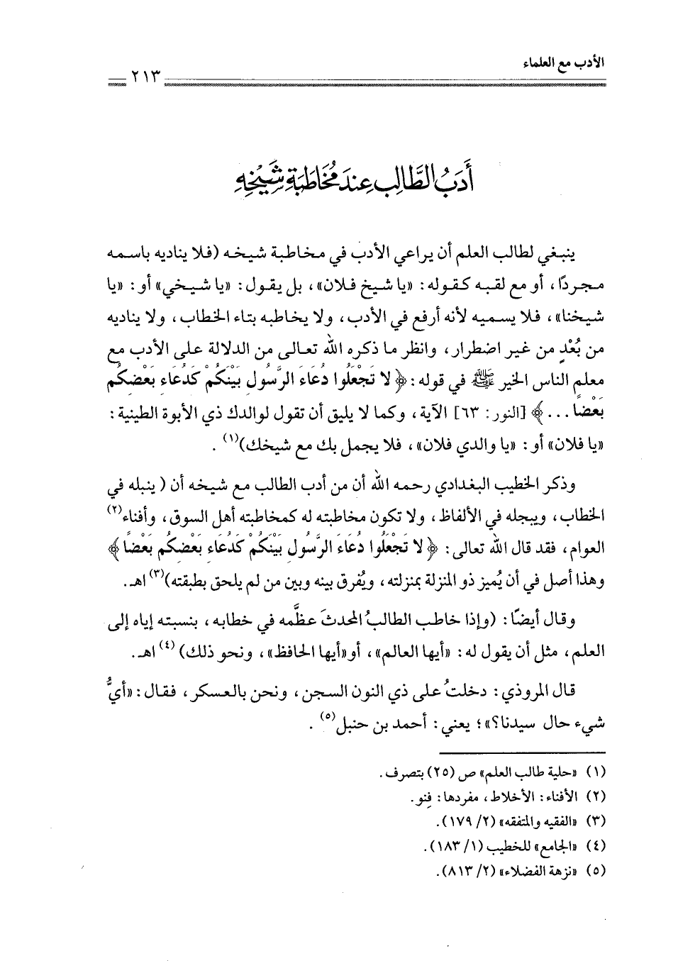 وذكر الخطيب البغدادي رحمه الله أن من أدب الطالب مع شيخه أن (ينبله في الخطاب، ويبجله في الألفاظ، ولا تكون مخاطبته له كمخاطبته أهل السوق، وأفناء (¬2) العوام، فقد قال الله تعالى: {لَا تَجْعَلُوا دُعَاءَ الرَّسُولِ بَيْنَكُمْ كَدُعَاءِ بَعْضِكُمْ بَعْضًا} وهذا أصل في أن يُميز ذو المنزلة بمنزلته، ويُفرق بينه وبين من لم يلحق بطبقته) (¬3) اهـ.