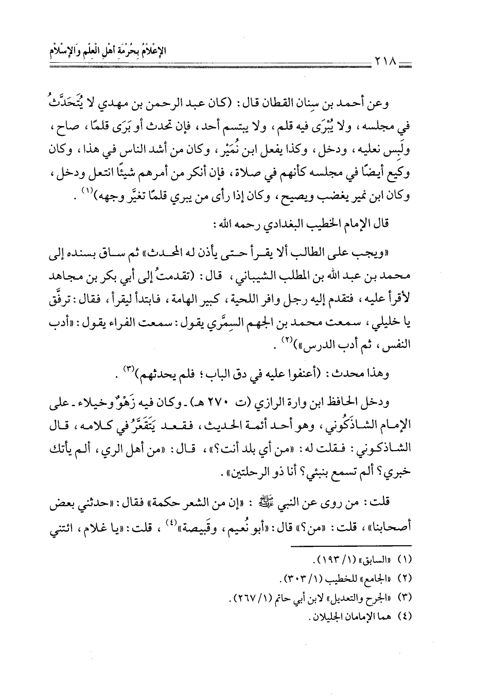 وعن أحمد بن سنان القطان قال: (كان عبد الرحمن بن مهدى لا يُتَحَدثُ في مجلسه , ولا يُبْرى فيه قلم , ولا يبتسْم أحد، فإن تحدث أو بَرَى قلمًا، صاح، ولبس نعليه، ودخل، وكذا يفعل ابن نمَيْر، وكان من أشد الناس في هذا، وكان وكيع أيضا في مجلسه كأنهم في صلاة، فإن أنكر من أمرهم شيئًا انتعل ودخل، وكان ابن نمير يغضب ويصيح، وكان إذا رأى من يبري قلمًا تغيَّر وجهه) (¬1).