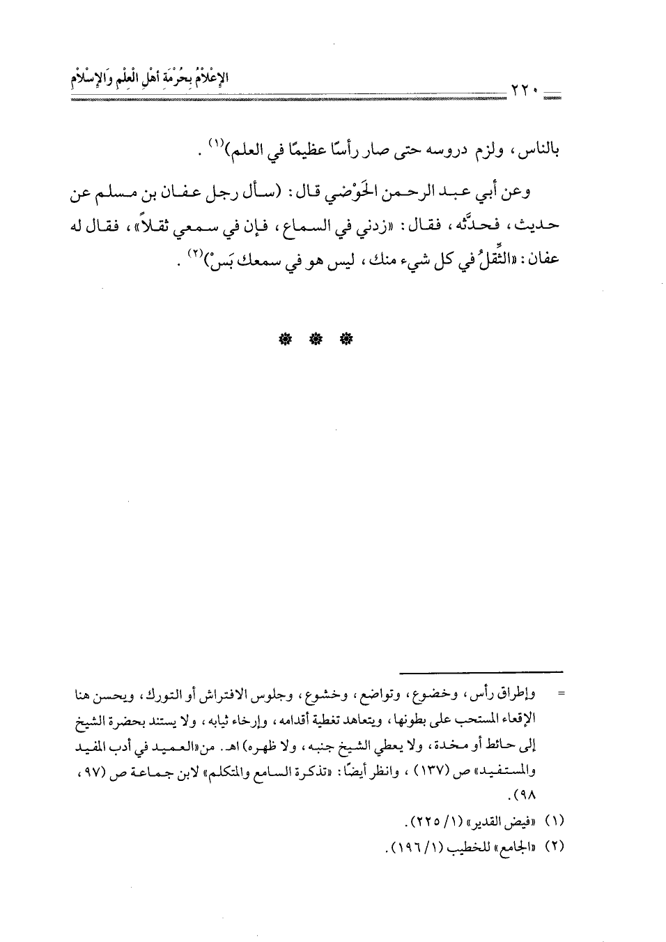 وعن أبي عبد الرحمن الحَوْضي قال: (سأل رجل عفان بن مسلم عن حديث، فحدَّثه، فقال: " زدني في السماع، فان في سمعي ثقلاً "، فقال له عفان: " الثِّقلُ في كل شيء منك , ليس هو في سمعك بَسْ) (¬2).