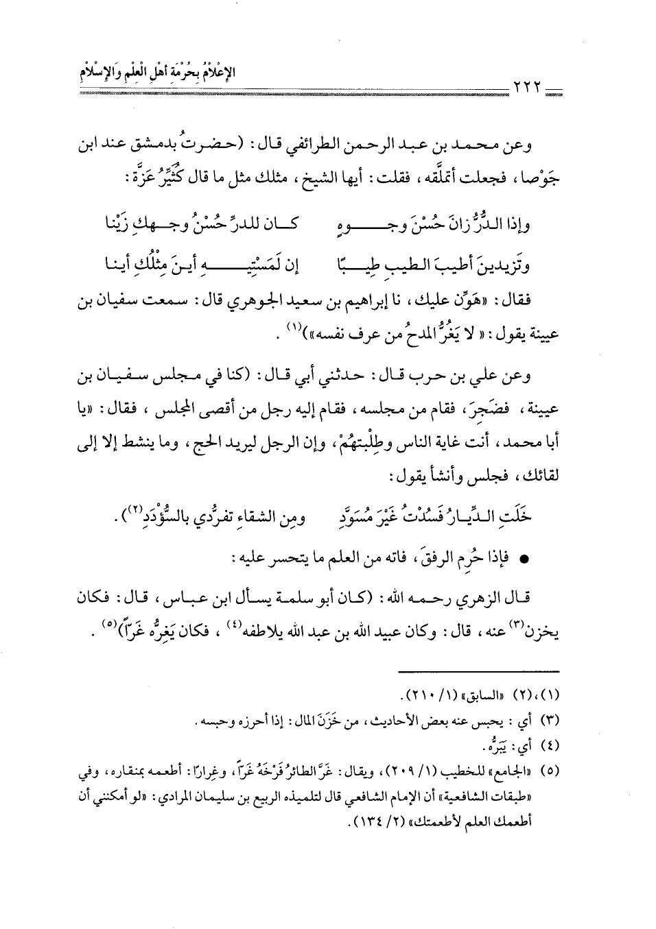 فقال: " هَوِّن عليك، نا إبراهيم بن سعيد الجوهري قال: سمعت سفيان بن عيينة يقول: " لا يغُر المدحُ من عرف نفسه ") (¬1).