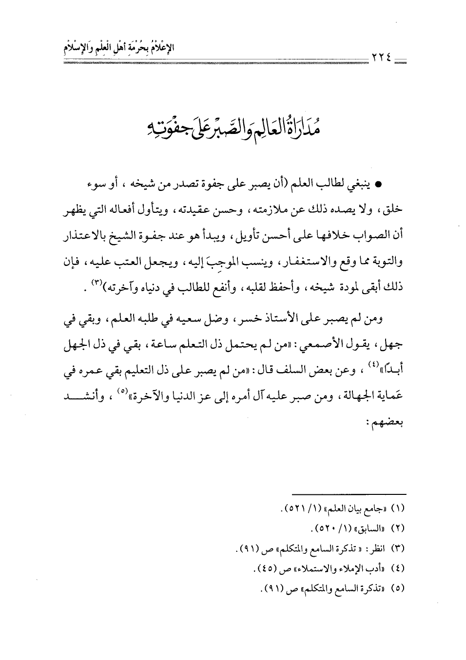 ومن لم يصبر على الأستاذ خسر، وضل سعيه في طلبه العلم، وبقي في جهل، يقول الأصمعي: " من لم يحتمل ذل التعلم ساعة، بقي في ذل الجهل أبدًا " (¬2)، وعن بعض السلف قال: " من لم يصبر على ذل التعليم بقي عمره في عَماية الجهالة، ومن صبر عليه آل أمره إلى عز الدنيا والآخرة " (¬3)، وأنشد بعضهم: