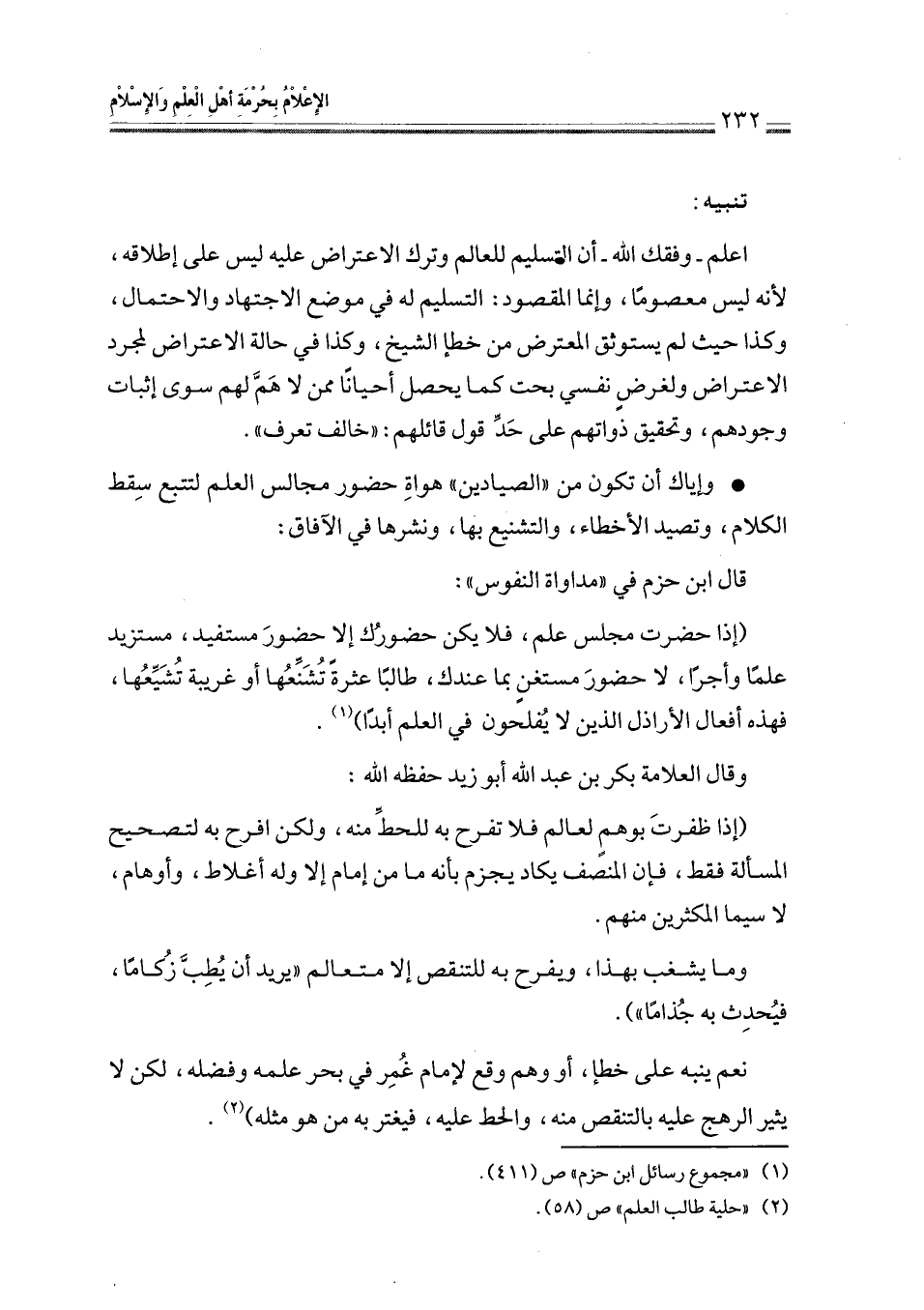 نعم ينبه على خطأ، أو وهم وقع لإمام غُمِر في بحر علمه وفضله، لكن لا يثير الرهج عليه بالتنقص منه، والحط عليه، فيغتر به من هو مثله) (¬2).