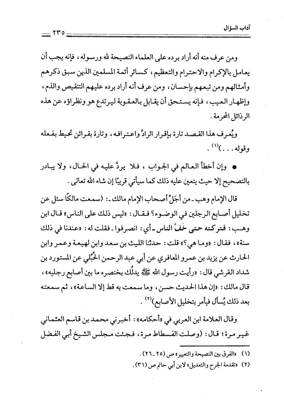 * وإن أخطأ العالم في الجواب، فلا يرد عليه في الحال، ولا يبادر بالتصحيح إلا حيث يتعين عليه ذلك كما سيأتي قريبًا إن شاء الله تعالى.