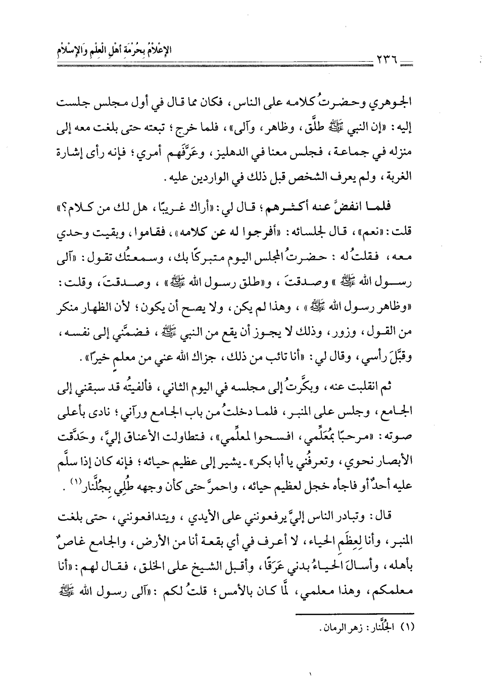 ثم انقلبت عنه، وبكَرتُ إلى مجلسه في اليوم الثاني، فألفيتُه قد سبقني إلى الجامع، وجلس على المنبر، فلما دخلتُ من باب الجامع ورآني؛ نادى بأعلى صوته: " مرحبًا بمُعَلّمي، افسحوا لمعلِّمي "، فتطاولت الأعناق إليَّ، وحَدَّقت الأبصار نحوي، وتعرفُني يا أبا بكر " -يشير إلى عظيم حيائه؛ فإنه كان إذا سلم عليه أحدٌ أو فاجأه خجل لعظيم حيائه، واحمرَّ حتى كان وجهه طُلِي بِجُلَّنار (¬1).
