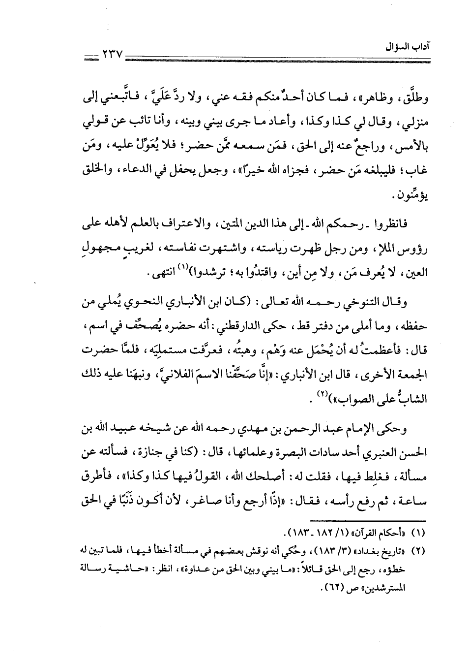 (¬2) " تاريخ بغداد " (3/ 183)، وحُكي أنه نوقش بعضهم في مسألة أخطأ فيها، فلما تبين له خطؤه، رجع إلى الحق قائلاً: " ما بيني وبين الحق من عداوة "، انظر: " حاشية رسالة المسترشدين " ص (62).