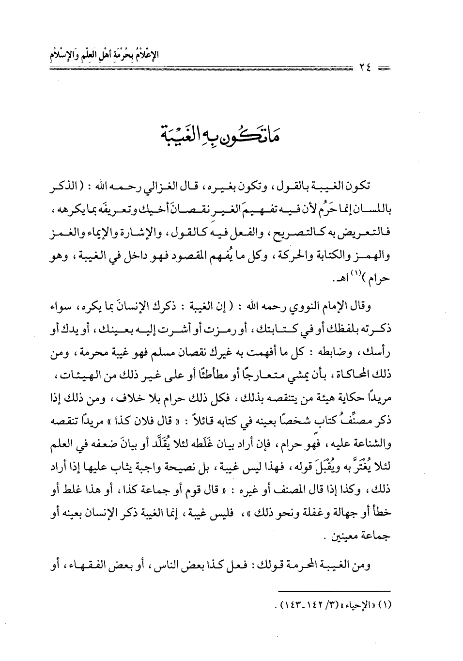 وقال الإمام النووي رحمه الله: (إن الغيبة: ذكرك الإنسانَ بما يكره، سواء ذكرته بلفظك أو في كتابتك، أو رمزت أو أشرت إليه بعينك، أو يدك أو رأسك، وضابطه: كل ما أفهمت به غيرك نقصان مسلم فهو غيبة محرمة، ومن ذلك المحاكاة، بأن يمشي متعارجًا أو مطأطئًا أو على غير ذلك من الهيئات، مريدًا حكاية هيئة من يتنقصه بذلك، فكل ذلك حرام بلا خلاف، ومن ذلك إذا ذكر مصنِّفُ كتابٍ شخصًا بعينه في كتابه قائلاً: " قال فلان كذا " مريدًا تنقصه والشناعة عليه، فهو حرام، فإن أراد بيان غَلَطه لئلا يُقَلَّد أو بيانَ ضعفه في العلم لئلا يُغترَّ به ويُقبلَ قوله، فهذا ليس غيبة، بل نصيحة واجبة يثاب عليها إذا أراد ذلك، وكذا إذا قال المصنف أو غيره: " قال قوم أو جماعة كذا، أو هذا غلط أو خطأ أو جهالة وغفلة ونحو ذلك "، فليس غيبة، إنما الغيبة ذكر الإنسان بعينه أو جماعة معينين.
