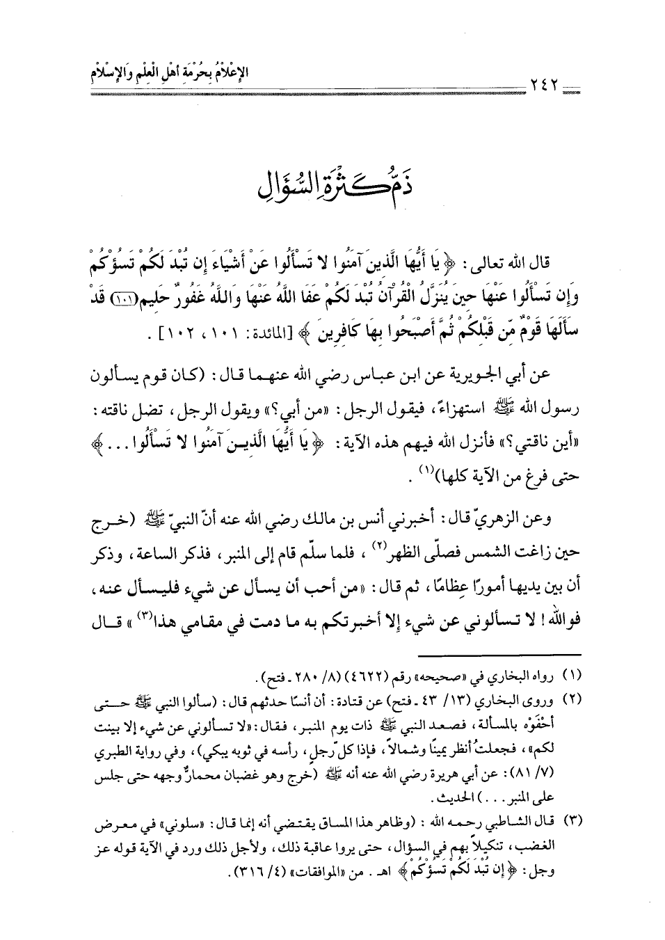 قال الله تعالى: {يَا أَيُّهَا الَّذِينَ آمَنُوا لَا تَسْأَلُوا عَنْ أَشْيَاءَ إِنْ تُبْدَ لَكُمْ تَسُؤْكُمْ وَإِنْ تَسْأَلُوا عَنْهَا حِينَ يُنَزَّلُ الْقُرْآنُ تُبْدَ لَكُمْ عَفَا اللَّهُ عَنْهَا وَاللَّهُ غَفُورٌ حَلِيمٌ (101) قَدْ سَأَلَهَا قَوْمٌ مِنْ قَبْلِكُمْ ثُمَّ أَصْبَحُوا بِهَا كَافِرِينَ (102)} [المائدة101: 102].