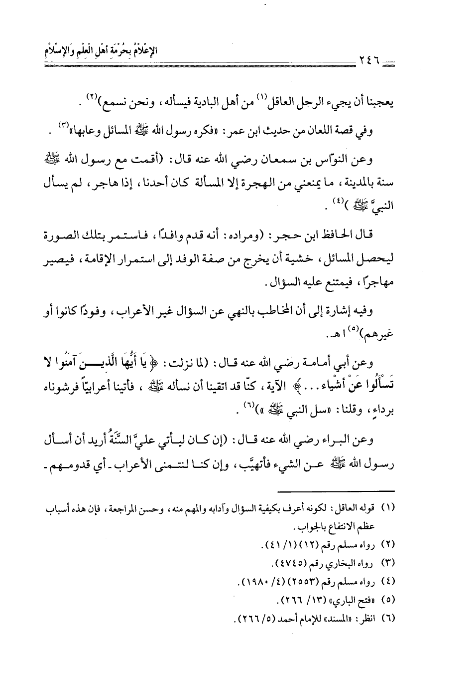 وعن النوّاس بن سمعان رضي الله عنه قال: (أقمت مع رسول الله - صلى الله عليه وسلم - سنة بالمدينة , ما يمنعني من الهجرة إلا المسألة كان أحدنا، إذا هاجر، لم يسأل النبيَّ - صلى الله عليه وسلم -) (¬4).