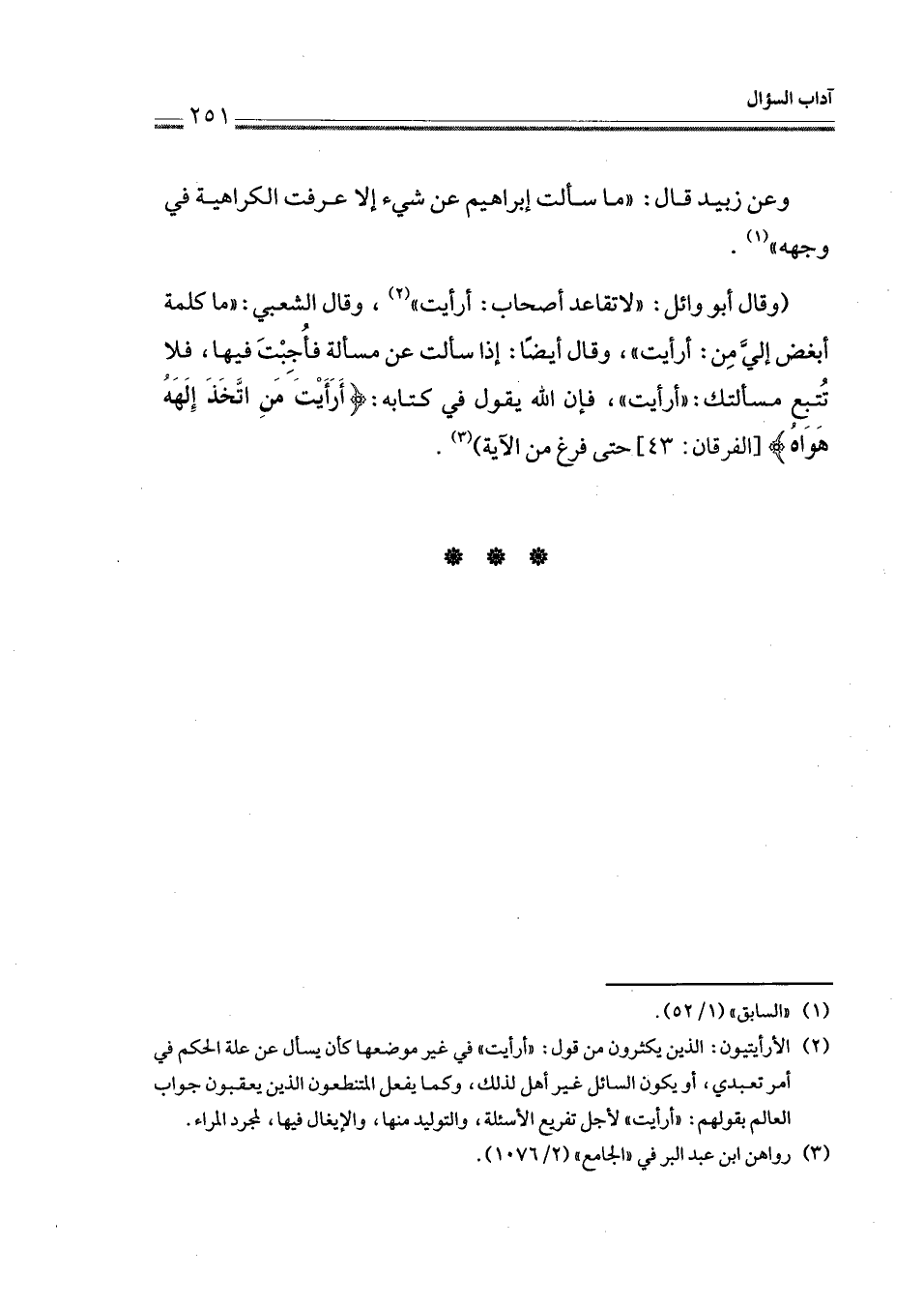 (وقال أبو وائل: " لاتقاعد أصحاب: أرأيت " (¬2)، وقال الشعبي: " ما كلمة أبغض إليَّ مِن: أرأيت "، وقال أيضًا: إذا سألت عن مسألة فأُجِبْتَ فيها، فلا تُتبع مسألتك: " أرأيت "، فإن الله يقول في كتابه: {أَرَأَيْتَ مَنِ اتَّخَذَ إِلَهَهُ هَوَاهُ} [الفرقان: 43]، حتى فرغ من الآية) (¬3).