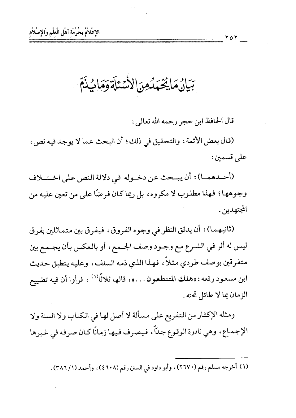 ثانيهما: أن يدقق النظر في وجوه الفروق، فيفرق بين متماثلين بفرق ليس له أثر في الشرع مع وجود وصف الجمع، أو بالعكس بأن يجمع بين متفرقين بوصف طردي مثلاً، فهذا الذي ذمه السلف، وعليه ينطبق حديث ابن مسعود رفعه: " هلك المتنطعون ... "، قالها ثلاثًا (¬1)، فرأوا أن فيه تضييع الزمان بما لا طائل تحته.