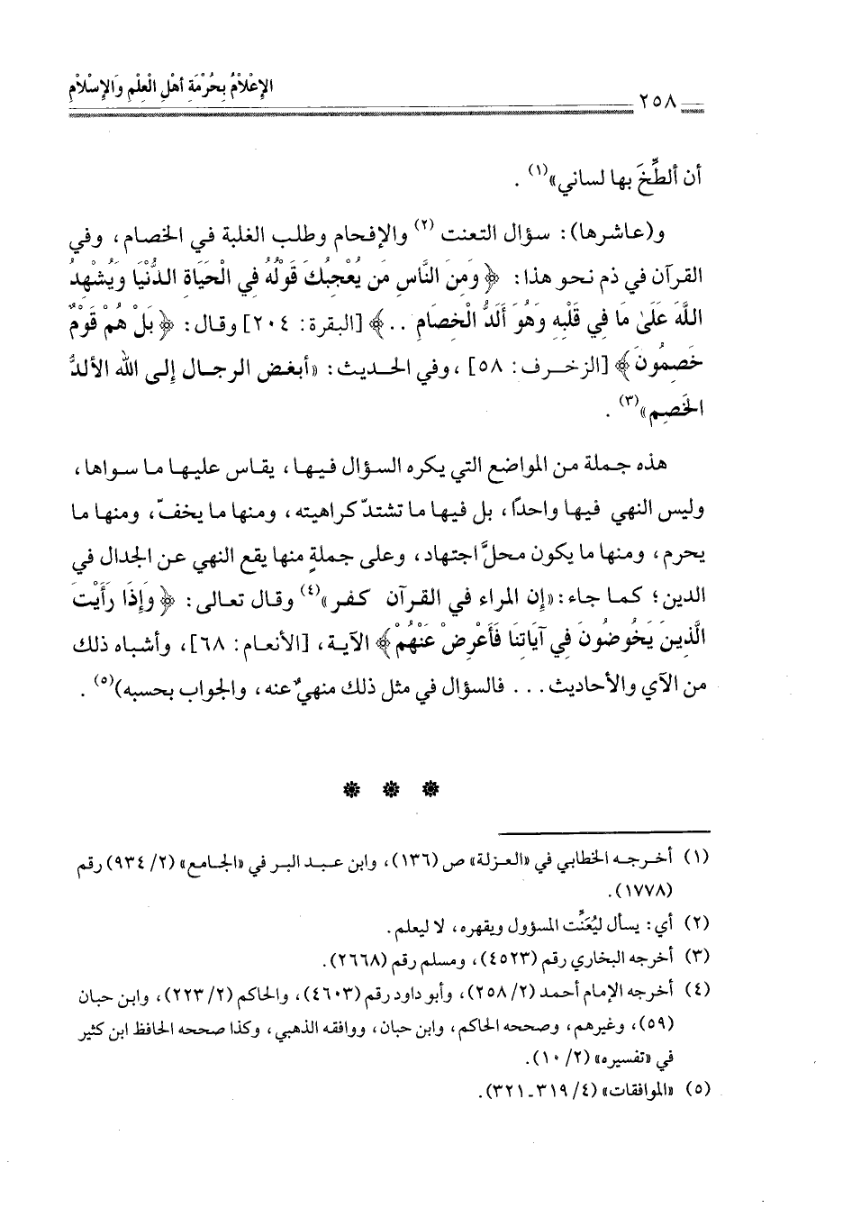 عاشرها: سؤال التعنت (¬2) والإفحام وطلب الغلبة في الخصام، وفي القرآن في ذم نحو هذا: {وَمِنَ النَّاسِ مَنْ يُعْجِبُكَ قَوْلُهُ فِي الْحَيَاةِ الدُّنْيَا وَيُشْهِدُ اللَّهَ عَلَى مَا فِي قَلْبِهِ وَهُوَ أَلَدُّ الْخِصَامِ} [البقرة: 204]، وقال: {بَلْ هُمْ قَوْمٌ خَصِمُونَ} [الزخرف: 58]، وفى الحديث: " أبغض الرجال إِلى الله الألد الخصِم " (¬3).