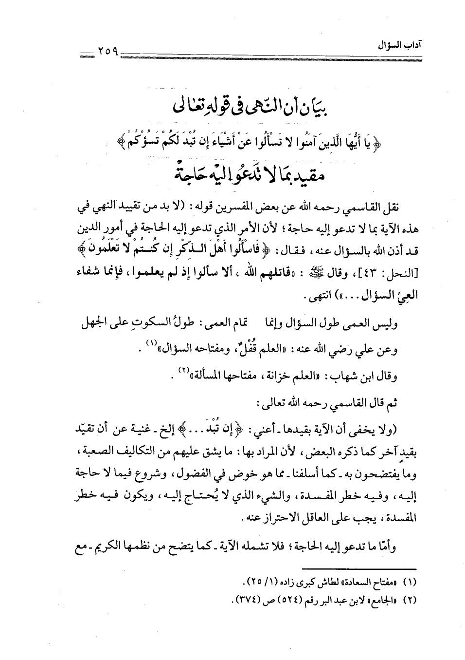 نقل القاسمي رحمه الله عن بعض المفسرين قوله: (لابد من تقييد النهي في هذه الآية بما لا تدعو إليه حاجة؛ لأن الأمر الذي تدعو إليه الحاجة في أمور الدين قد أذن الله بالسؤال عنه، فقال: {فَاسْأَلُوا أَهْلَ الذِّكْرِ إِنْ كُنْتُمْ لَا تَعْلَمُونَ} [النحل: 43] وقال - صلى الله عليه وسلم -: " قاتلهم الله، ألا سألوا إِذ لم يعلموا، فإِنما شفاء العِيِّ السؤال ... ") انتهى.