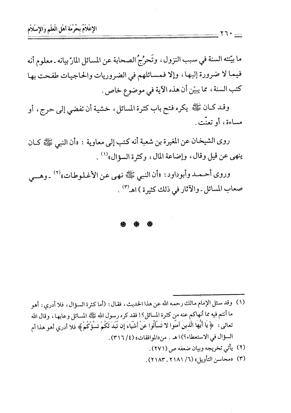 وقد كان - صلى الله عليه وسلم - يكره فتح باب كثرة المسائل، خشية أن تفضي إلى حرج، أو مساءة، أو تعنّت.