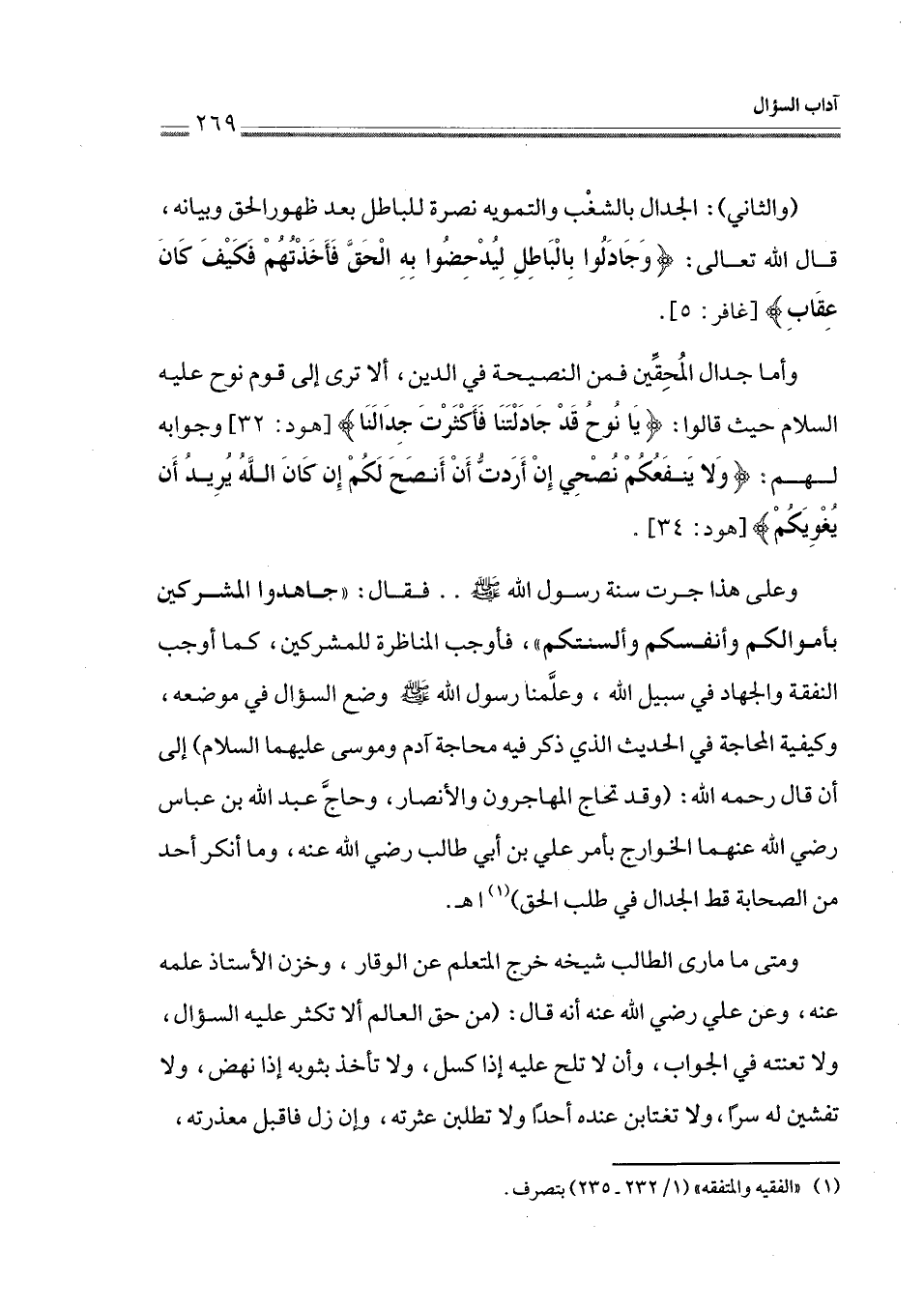 وعلى هذا جرت سنة رسول الله - صلى الله عليه وسلم - .. فقال: " جاهدوا المشركين بأموالكم وأنفسكم وألسنتكم "، فأوجب المناظرة للمشركين، كما أوجب النفقة والجهاد في سبيل الله، وعلَّمنا رسول الله - صلى الله عليه وسلم - وضع السؤال في موضعه، وكيفية المحاجة في الحديث الذي ذكر فيه محاجة آدم وموسى عليهما السلام) إلى أن قال رحمه الله: (وقد تحاج المهاجرون والأنصار، وحاجَّ عبد الله بن عباس رضي الله عنهما الخوارج بأمر علي بن أبي طالب رضي الله عنه، وما أنكر أحد من الصحابة قط الجدال في طلب الحق) (¬1) اهـ.