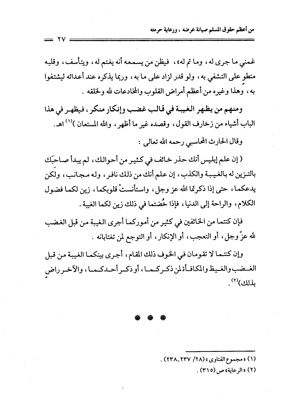 (إن علم إبليس أنك حذر خائف في كثير من أحوالك، لم يبدأ صاحبَك بالتزين له بالغيبة والكذب، إن علم أنك من ذلك نافر، وله مجانب، ولكن يدعكما، حتى إذا ذكرتما الله عز وجل، واستأنستْ قلوبكما، زين لكما فضول الكلام، والراحة إلى الدنيا، فإذا خُضتما في ذلك زين لكما الغيبة.