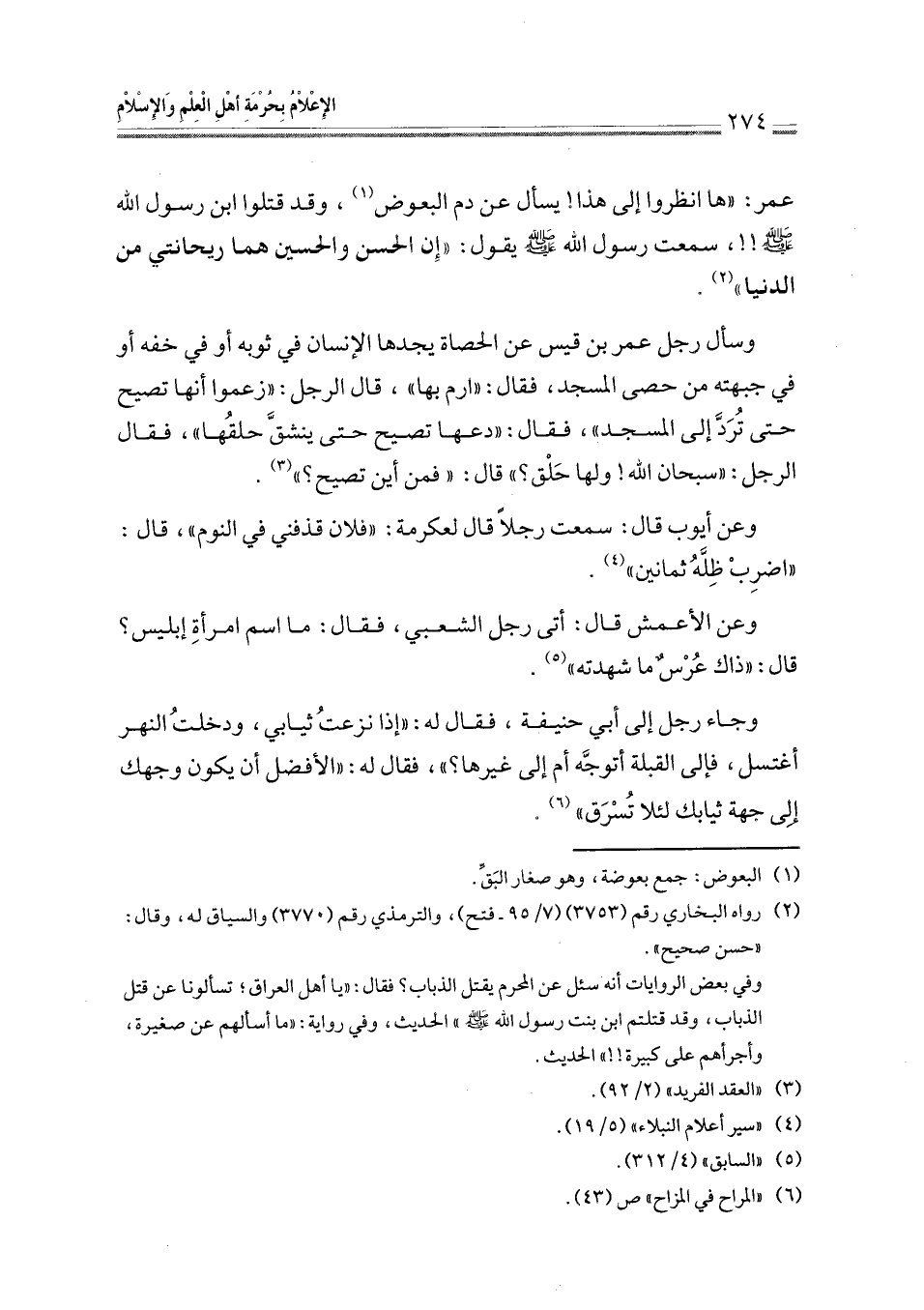 عمر: " ها انظروا إلى هذا! يسأل عن دم البعوض (¬1)، وقد قتلوا ابن بنت رسول الله - صلى الله عليه وسلم -!!، سمعت رسول الله - صلى الله عليه وسلم - يقول: " إِن الحسن والحسين هما ريحانتي من الدنيا " (¬2).