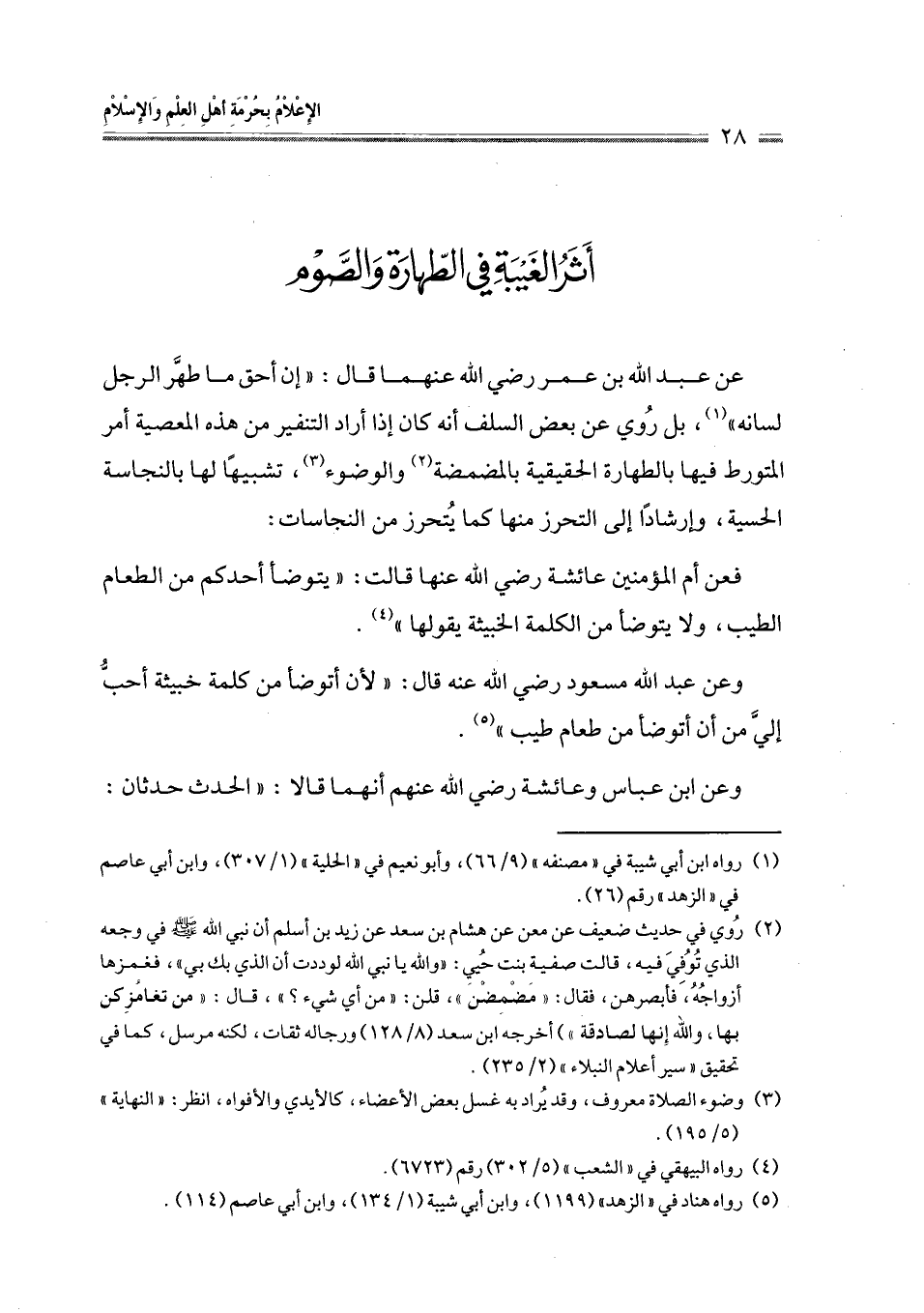 عن عبد الله بن عمر رضي الله عنهما قال: " إن أحق ما طهر الرجل لسانه " (¬1)، بل رُوي عن بعض السلف أنه كان إذا أراد التنفير من هذه المعصية أمر المتورط فيها بالطهارة الحقيقية بالمضمضة (¬2) والوضوء (¬3)، تشبيهًا لها بالنجاسة الحسية، وإرشادًا إلى التحرز منها كما يُتحرز من النجاسات:
