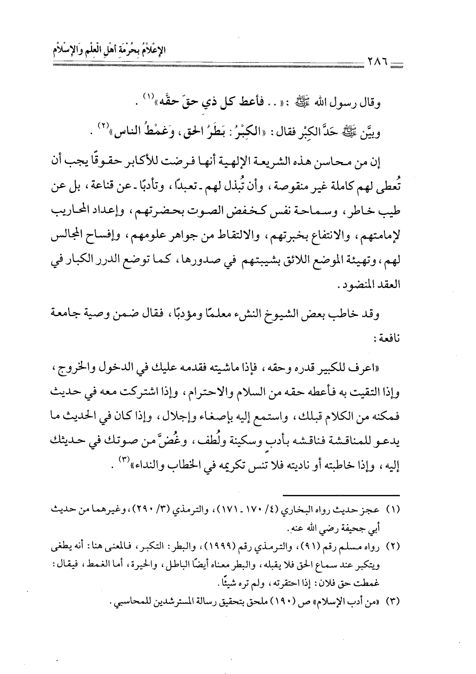 إن من محاسن هذه الشريعة الإلهية أنها فرضت للأكابر حقوقًا يجب أن تُعطى لهم كاملة غير منقوصة، وأن تُبذل لهم -تعبدًا، وتأدبًا- عن قناعة، بل عن طيب خاطر، وسماحة نفس كخفض الصوت بحضرتهم، وإعداد المحاريب لإمامتهم، والانتفاع بخبرتهم، والالتقاط من جواهر علومهم، وإفساح المجالس لهم , وتهيئة الموضع اللائق بشيبتهم في صدورها، كما توضع الدرر الكبار في العقد المنضود.