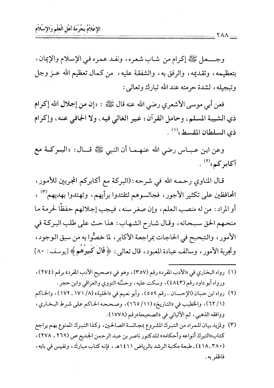 فعن أبي موسى الأشعري رضي الله عنه قال - صلى الله عليه وسلم -: " إِن من إِجلال الله إِكرام ذي الشيية المسلم، وحامل القرآن؛ غير الغالي فيه، ولا الجافي عنه، وإِكرام ذى السلطان المقسط " (¬1).