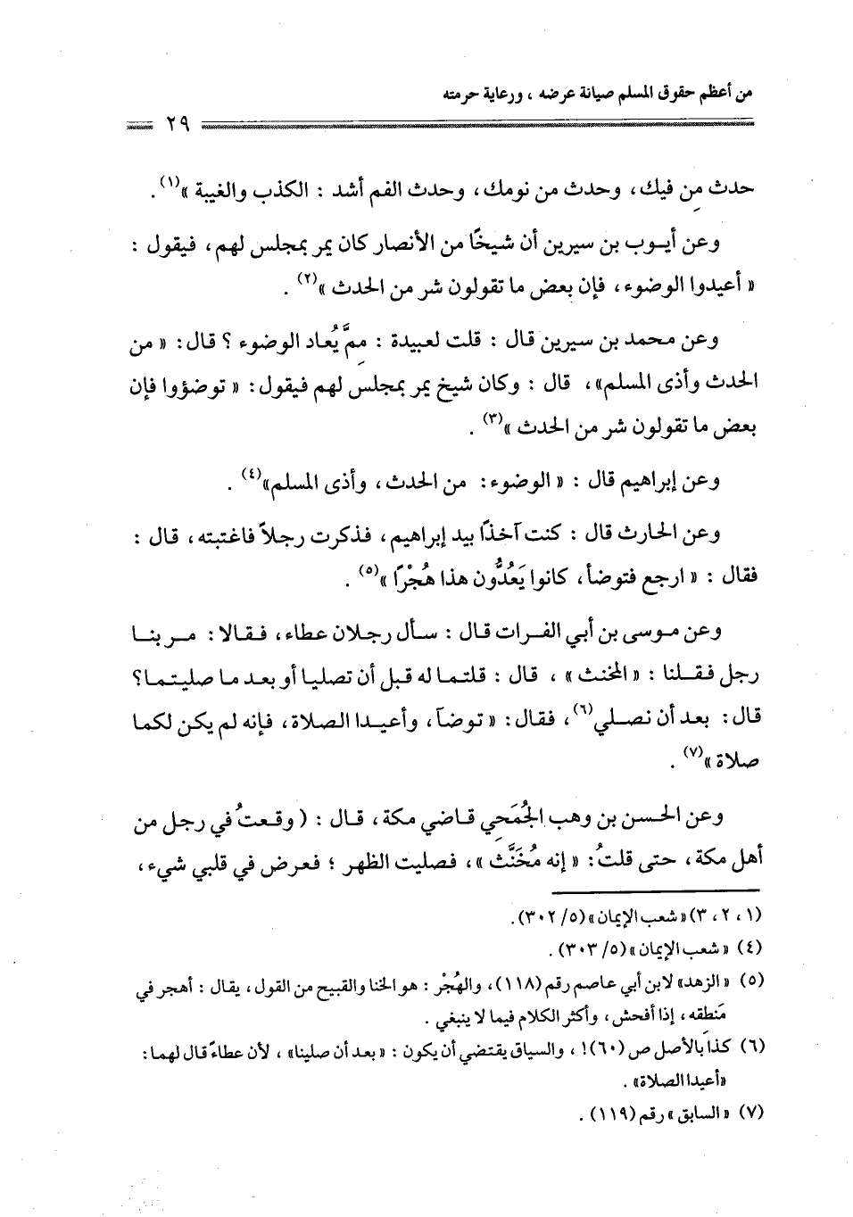 وعن محمد بن سيرين قال: قلت لعبيدة: ممَّ يُعاد الوضوء؟ قال: " من الحدث وأذى المسلم "، قال: وكان شيخ يمر بمجلس لهم فيقول: " توضؤوا فإن بعض ما تقولون شر من الحدث " (¬3).