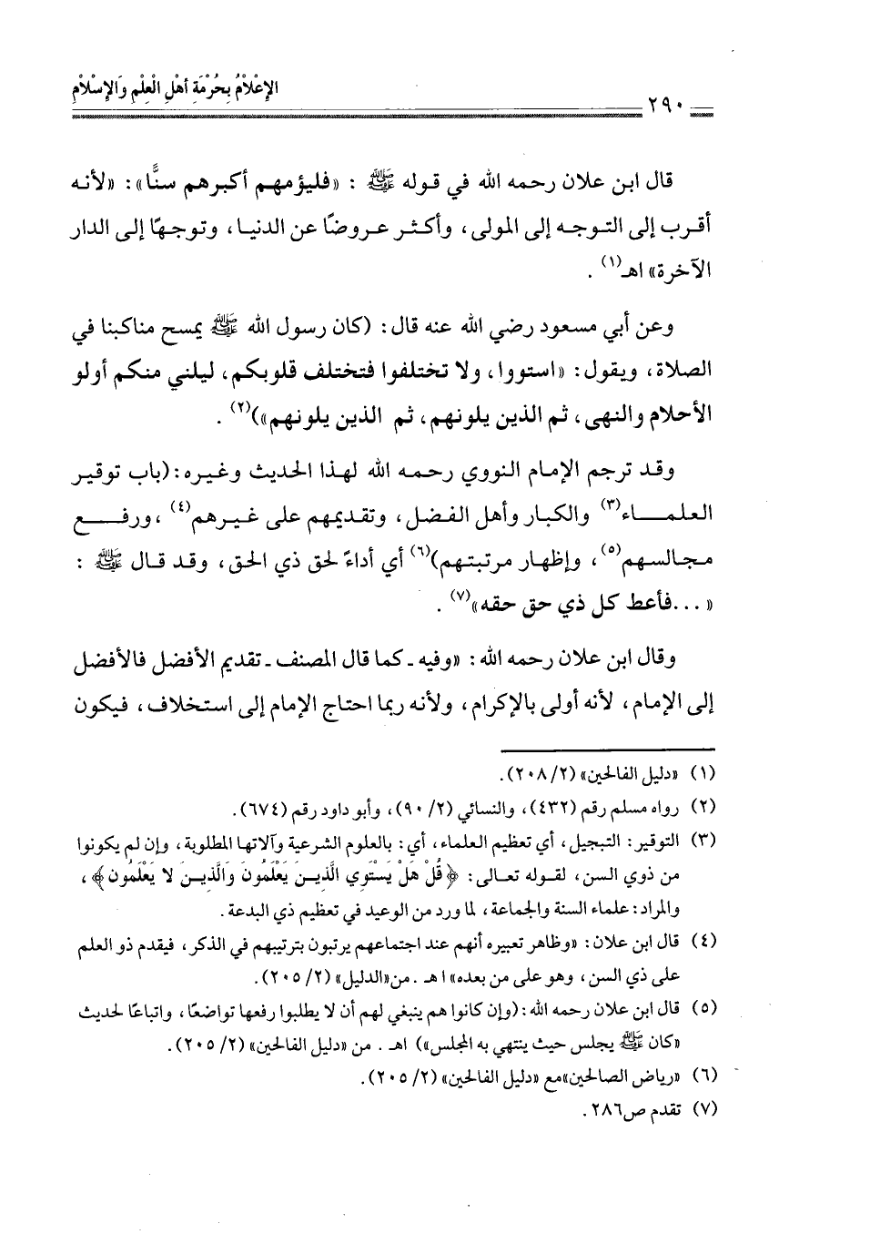 (¬4) قال ابن علان: " وظاهر تعبيره أنهم عند اجتماعهم يرتبون بترتيبهم في الذكر، فيقدم ذو العلم على ذي السن، وهو على من بعده " اهـ. من " الدليل " (2/ 205).