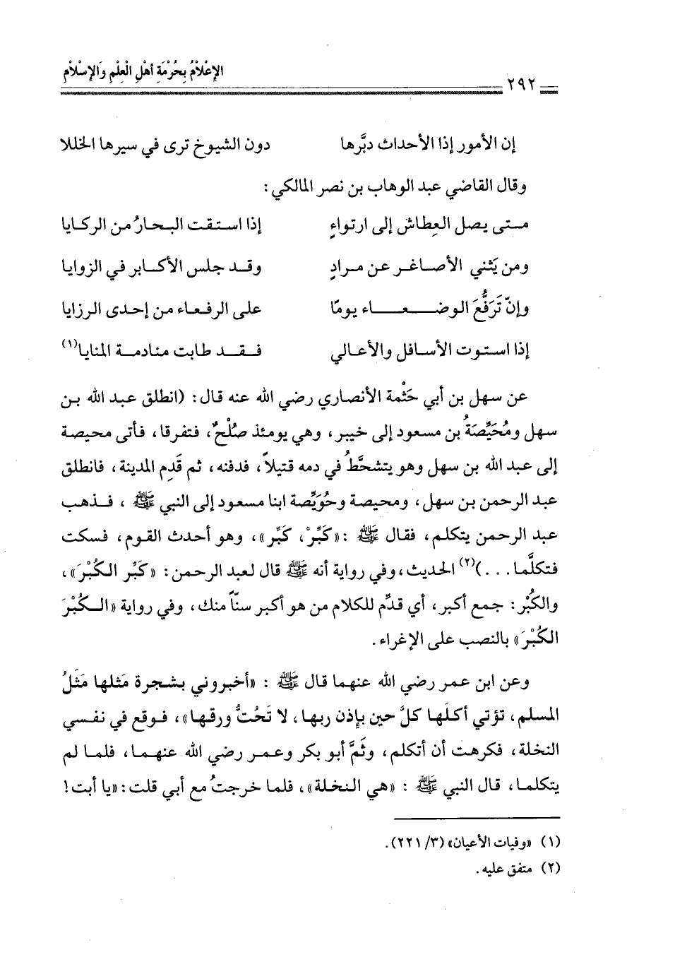 عن سهل بن أبي حَثْمة الأنصاري رضي الله عنه قال: (انطلق عبد الله بن سهل ومُحَيِّصَةُ بن مسعود إلى خيبر، وهي يومئذ صُلْحٌ، فتفرقا، فأتى محيصة إلى عبد الله بن سهل وهو يتشحَّطُ في دمه قتيلاً، فدفنه، ثم قَدِم المدينة، فانطلق عبد الرحمن بن سهل، ومحيصة وحُوَيِّصة ابنا مسعود إلى النبي - صلى الله عليه وسلم -، فذهب عبد الرحمن يتكلم، فقال - صلى الله عليه وسلم -: " كَبِّرْ، كَبِّر "، وهو أحدث القوم، فسكت فتكلَّما ... ) (¬2) الحديث، وفي رواية أنه - صلى الله عليه وسلم - قال لعبد الرحمن: " كبِّر الكُبْرَ "، والكُبْر: جمع أكبر، أي قدِّم للكلام من هو أكبر سنًّا منك، وفي رواية " الكُبْرَ الكُبْرَ " بالنصب على الإغراء.