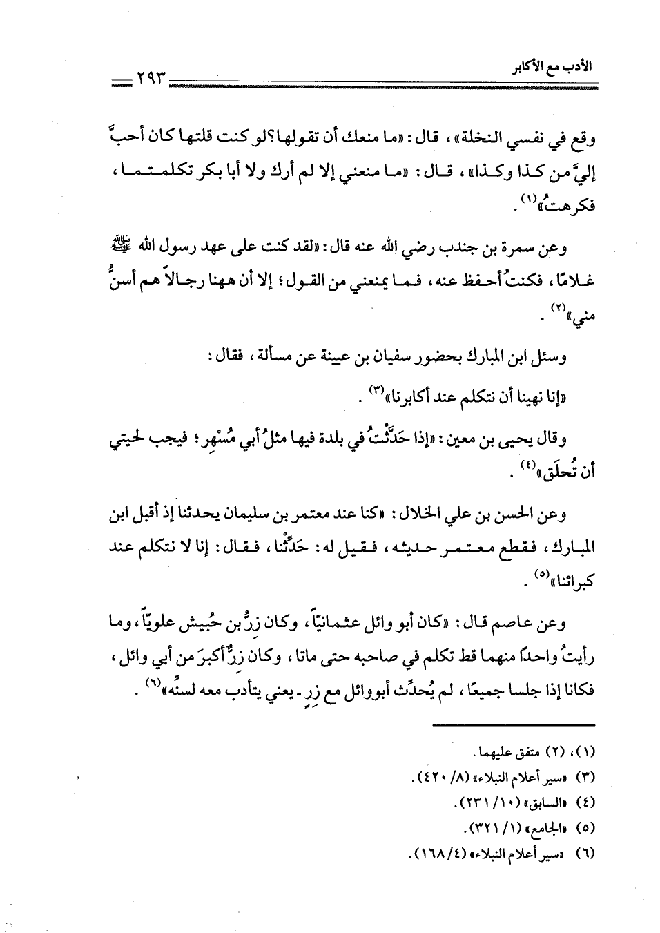 وعن الحسن بن علي الخلال: " كنا عند معتمر بن سليمان يحدثنا إذ أقبل ابن المبارك، فقطع معتمر حديثه، فقيل له: حدِّثْنا، فقال: إنا لا نتكلم عند كبرائنا " (¬5).