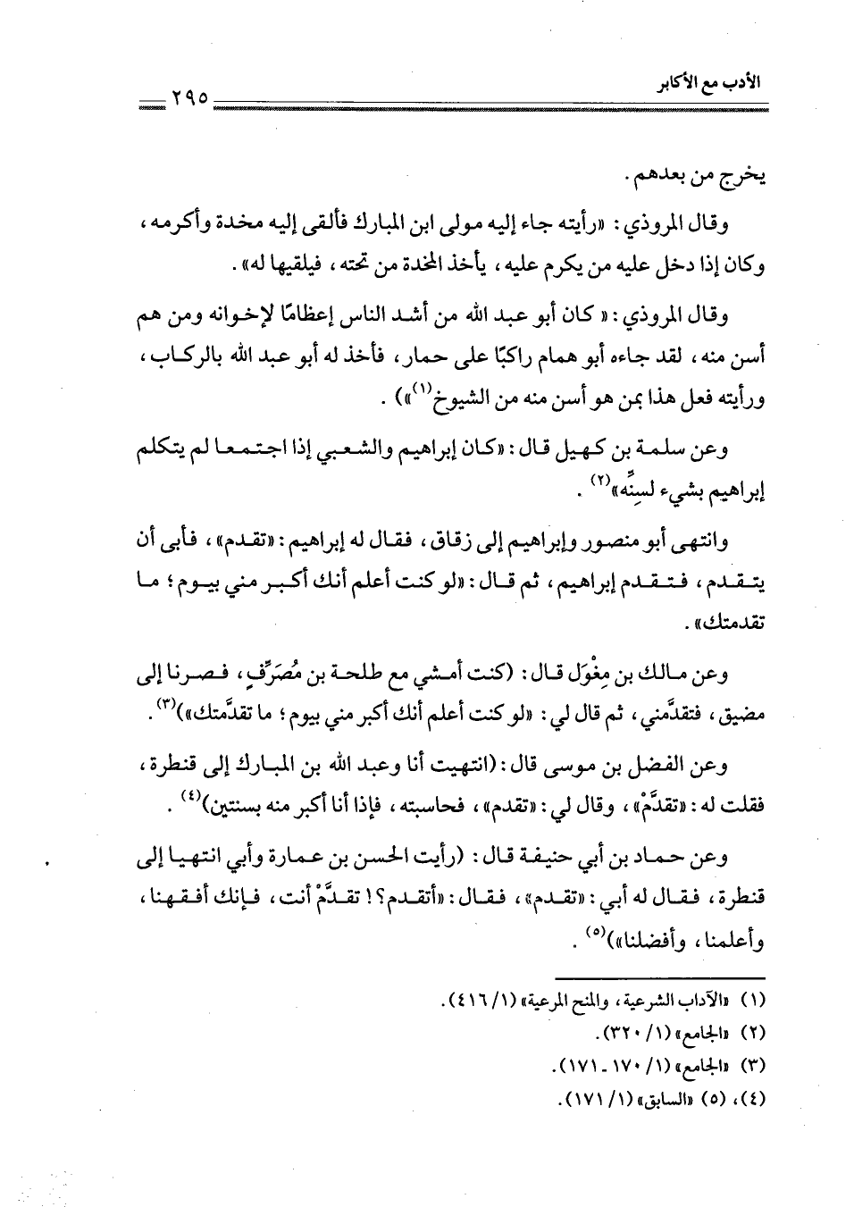 وقال المروذي: " كان أبو عبد الله من أشد الناس إعظامًا لإخوانه ومن هم أسن منه، لقد جاءه أبو همام راكبًا على حمار، فأخذ له أبو عبد الله بالركاب، ورأيته فعل هذا بمن هو أسن منه من الشيوخ (¬1) ").