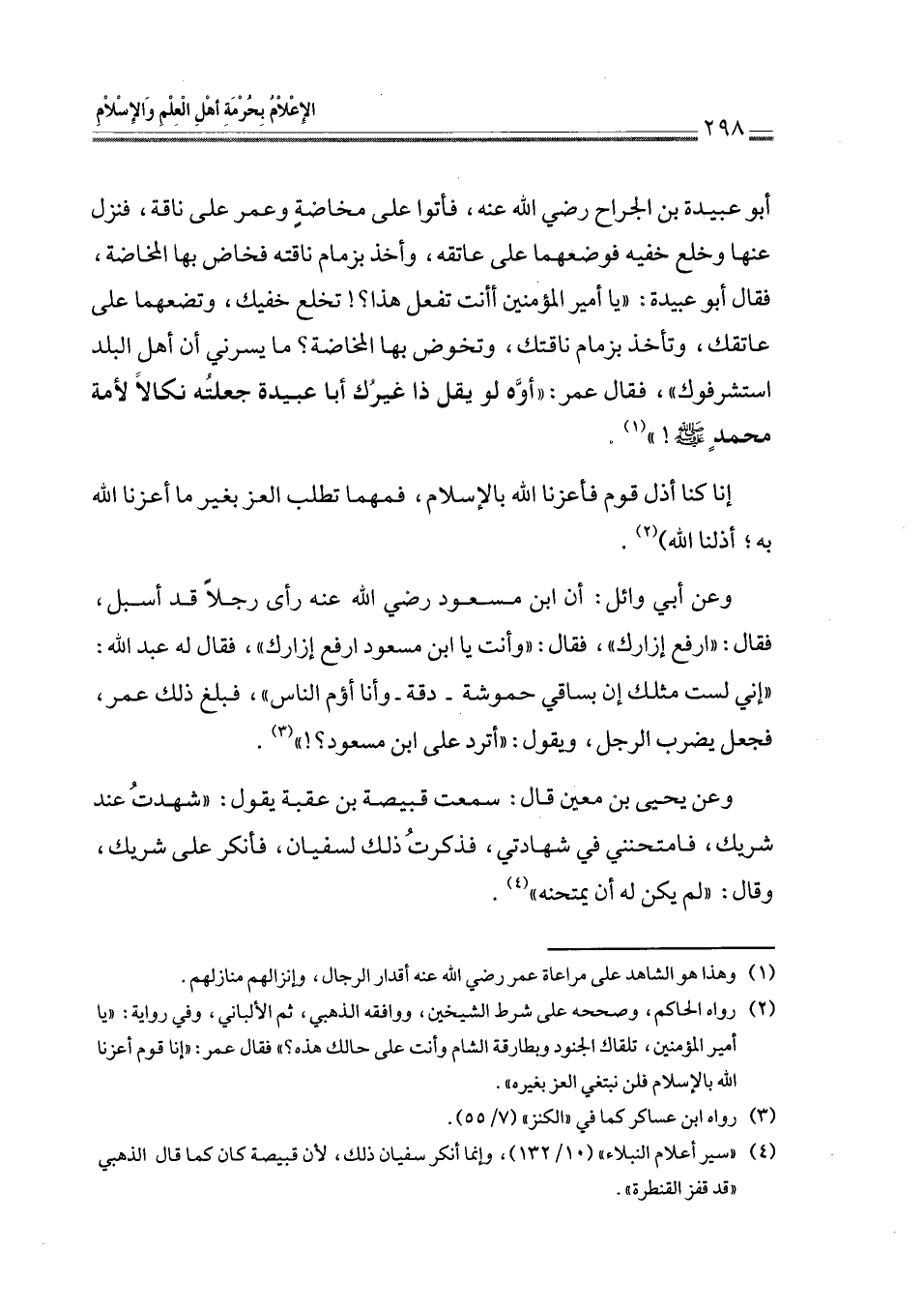 أبو عبيدة بن الجراح رضي الله عنه، فأتوا على مخاضةٍ وعمر على ناقة، فنزل عنها وخلع خفيه فوضعهما على عاتقه، وأخذ بزمام ناقته فخاض بها الخاضة، فقال أبو عبيدة: " يا أمير المؤمنين أأنت تفعل هذا؟! تخلع خفيك، وتضعهما على عاتقك، وتأخذ بزمام ناقتك، وتخوض بها الخاضة؟ ما يسرني أن أهل البلد استشرفوك "، فقال عمر: " أوَّه لو يقل ذا غيرُك أبا عبيدة جعلتُه نكالاً لأمة محمدٍ - صلى الله عليه وسلم -! " (¬1).