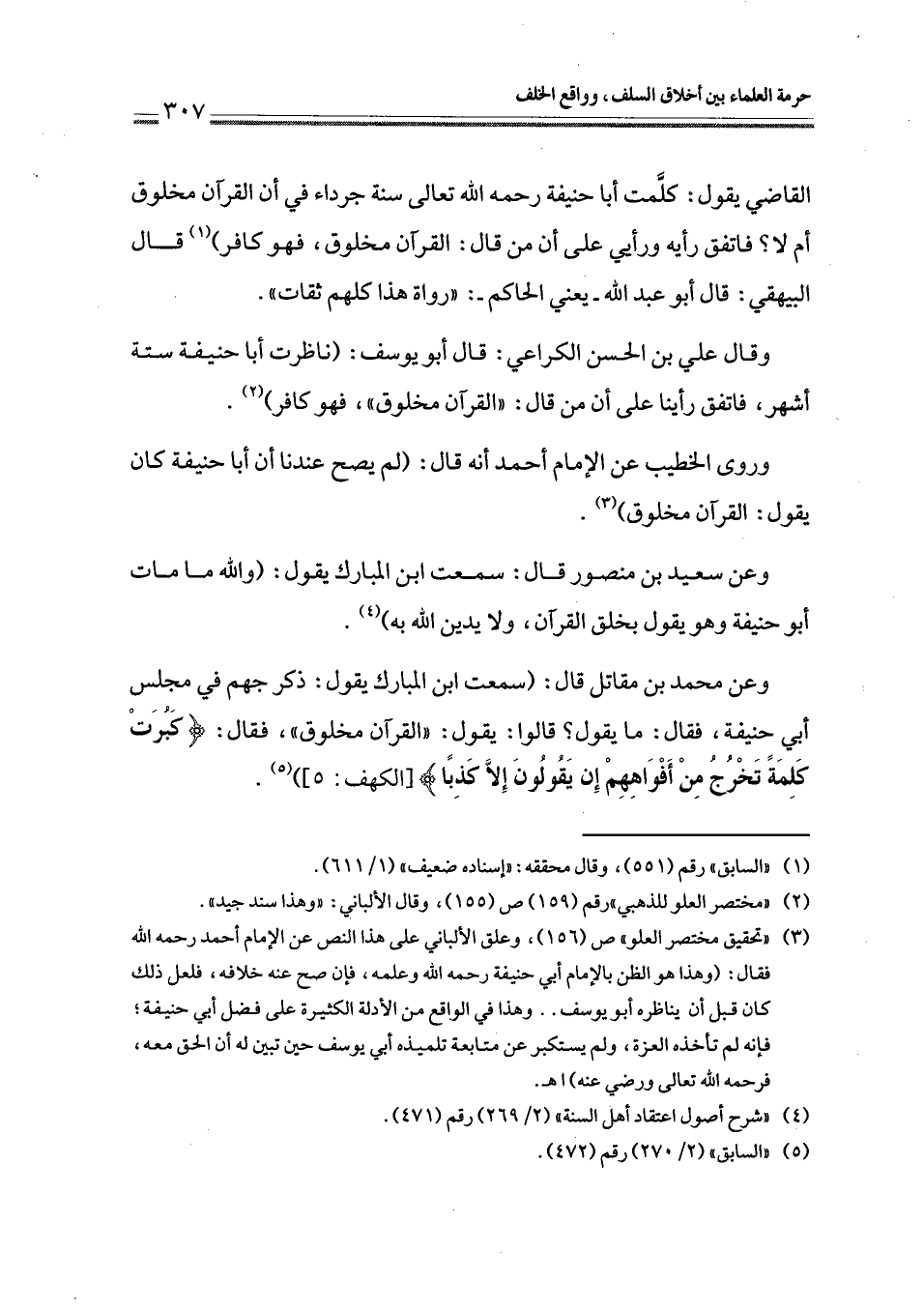 وعن محمد بن مقاتل قال: (سمعت ابن المبارك يقول: ذكر جهم في مجلس أبي حنيفة، فقال: ما يقول؟ قالوا: يقول: " القرآن مخلوق "، فقال: {كَبُرَتْ كَلِمَةً تَخْرُجُ مِنْ أَفْوَاهِهِمْ إِنْ يَقُولُونَ إِلَّا كَذِبًا} [الكهف: 5] (¬5).