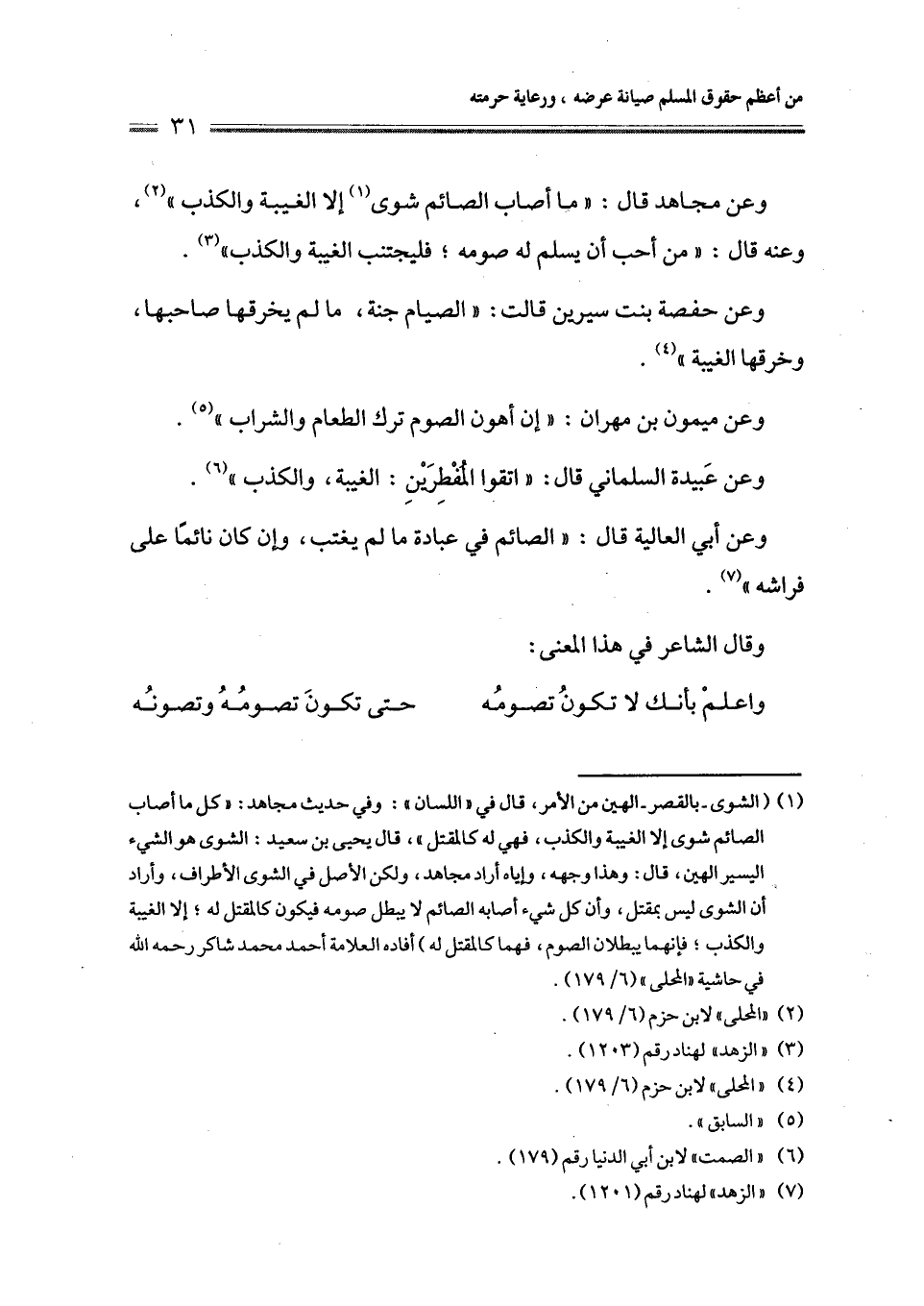وعن حفصة بنت سيرين قالت: " الصيام جنة، ما لم يخرقها صاحبها، وخرقها الغيبة " (¬4).