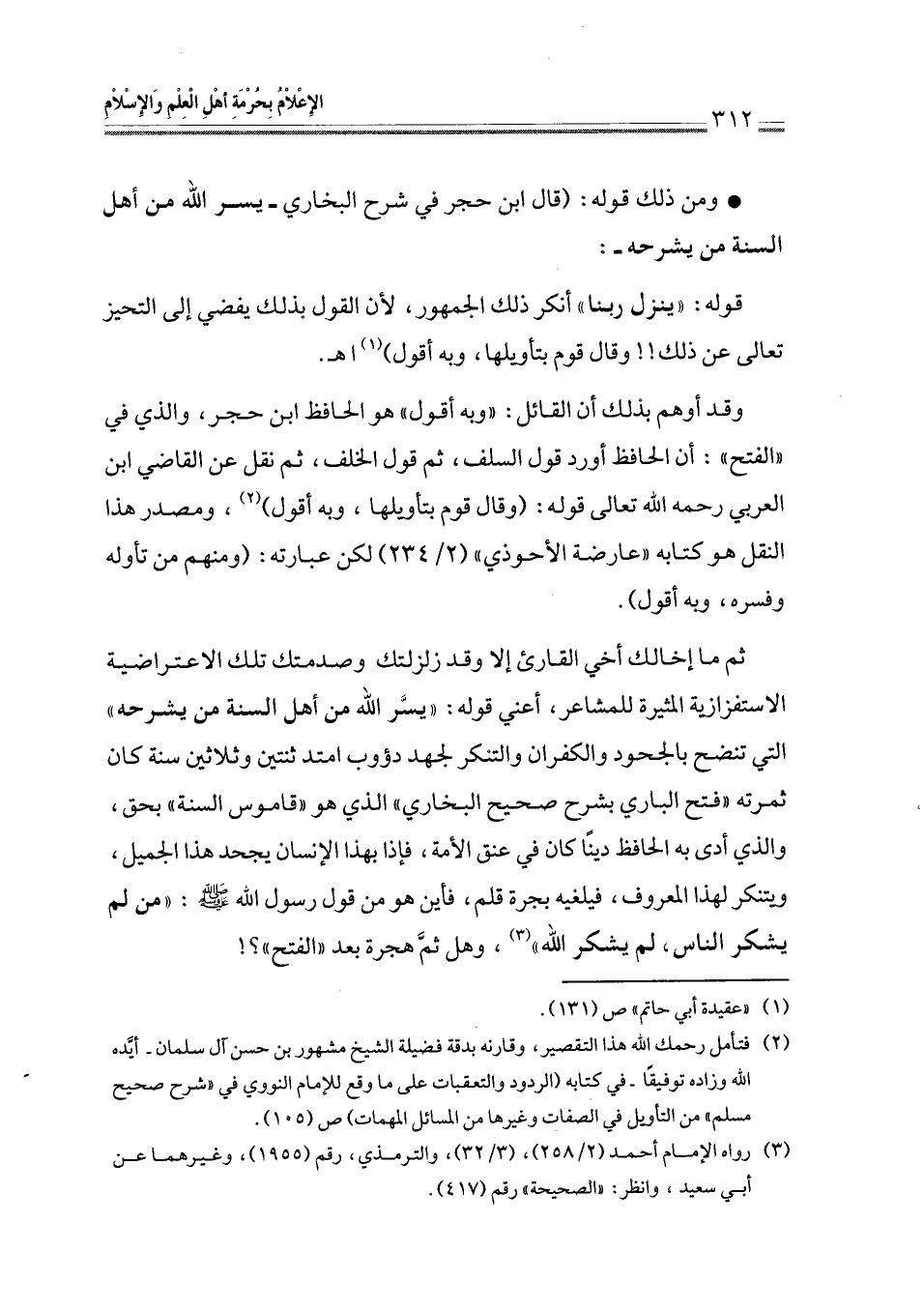 وقد أوهم بذلك أن القائل: " وبه أقول " هو الحافظ ابن حجر، والذي في " الفتح ": أن الحافظ أورد قول السلف، ثم قول الخلف، ثم نقل عن القاضي ابن العربي رحمه الله تعالى قوله: (وقال قوم بتأويلها، وبه أقول) (¬2)، ومصدر هذا النقل هو كتابه " عارضة الأحوذي " (2/ 234) لكن عبارته: (ومنهم من تأوله وفسره، وبه أقول).