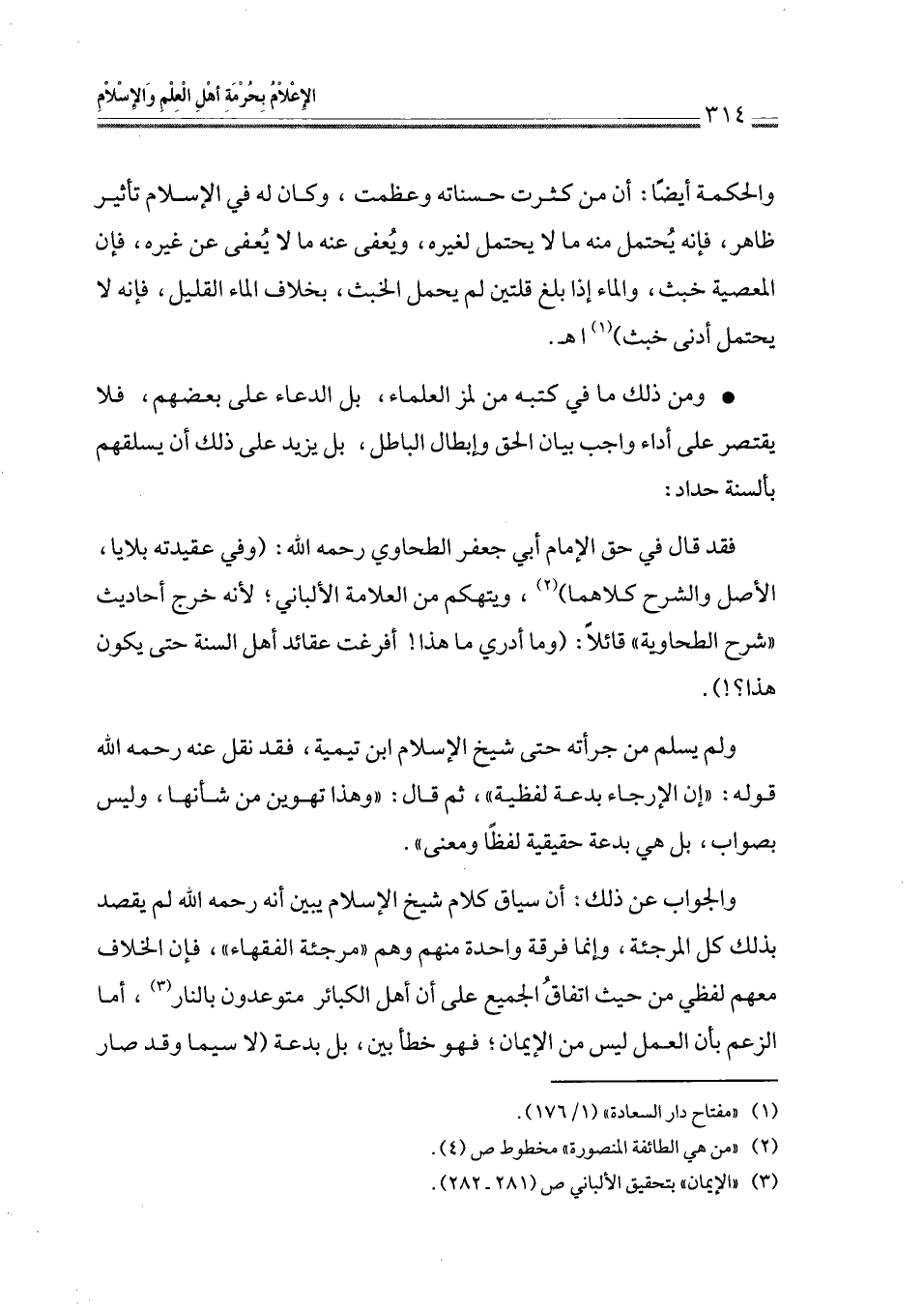 * ومن ذلك ما في كتبه من لمز العلماء، بل الدعاء على بعضهم، فلا يقتصر على أداء واجب بيان الحق وإبطال الباطل، بل يزيد على ذلك أن يسلقهم بألسنة حداد:
