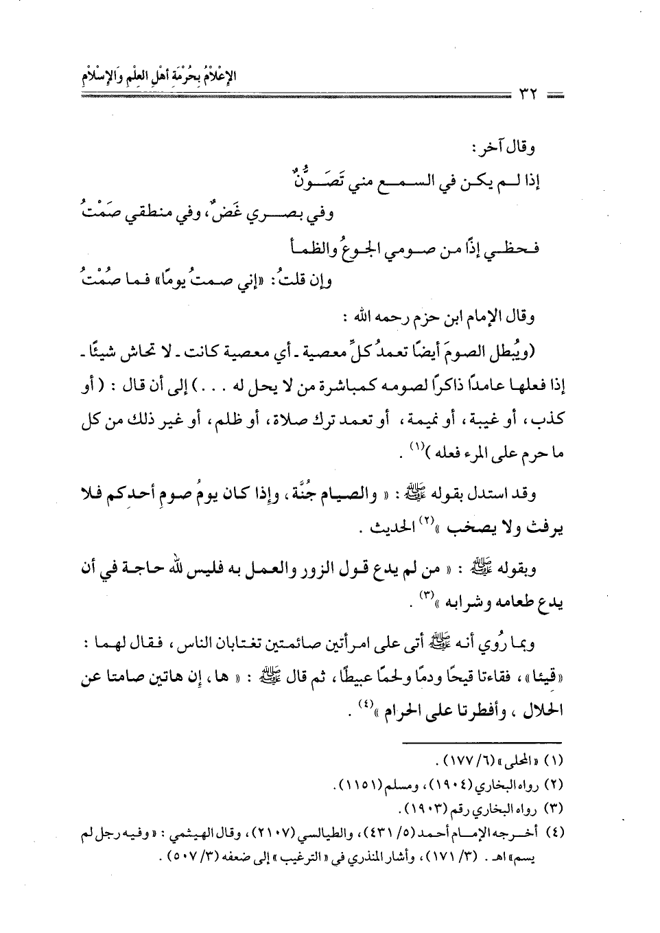 وبقوله - صلى الله عليه وسلم -: " من لم يدع قول الزور والعمل به فليس لله حاجة في أن يدع طعامه وشرابه " (¬3).