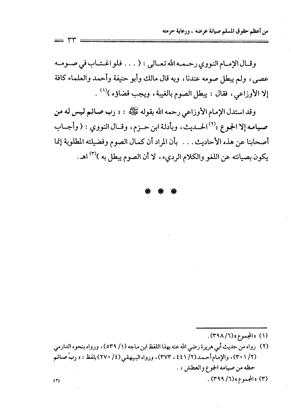 وقد استدل الإمام الأوزاعي رحمه الله بقوله - صلى الله عليه وسلم -: " رب صائم ليس له من صيامه إِلا الجوع " (¬2) الحديث، وبأدلة ابن حزم، وقال النووي: (وأجاب أصحابنا عن هذه الأحاديث ... بأن المراد أن كمال الصوم وفضيلته المطلوبة إنما يكون بصيانته عن اللغو والكلام الرديء، لا أن الصوم يبطل به) (¬3) اهـ.