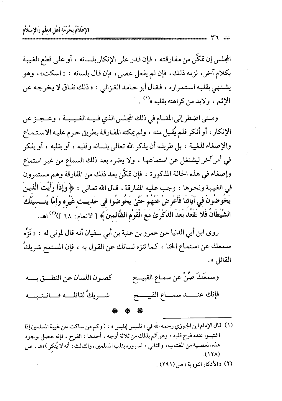 (¬1) قال الإمام ابن الجوزي رحمه الله في " تلبيس إبليس ": (وكم من ساكت عن غيبة المسلمين إذا اغتيبوا عنده فرح قلبه، وهو آثم بذلك من ثلاثة أوجه، أحدها: الفرح، فإنه حصل بوجود هذه المعصية من المغتاب، والثاني: لسروره بثلب المسلمين، والثالث: أنه لا يُنكر) اهـ. ص (128).