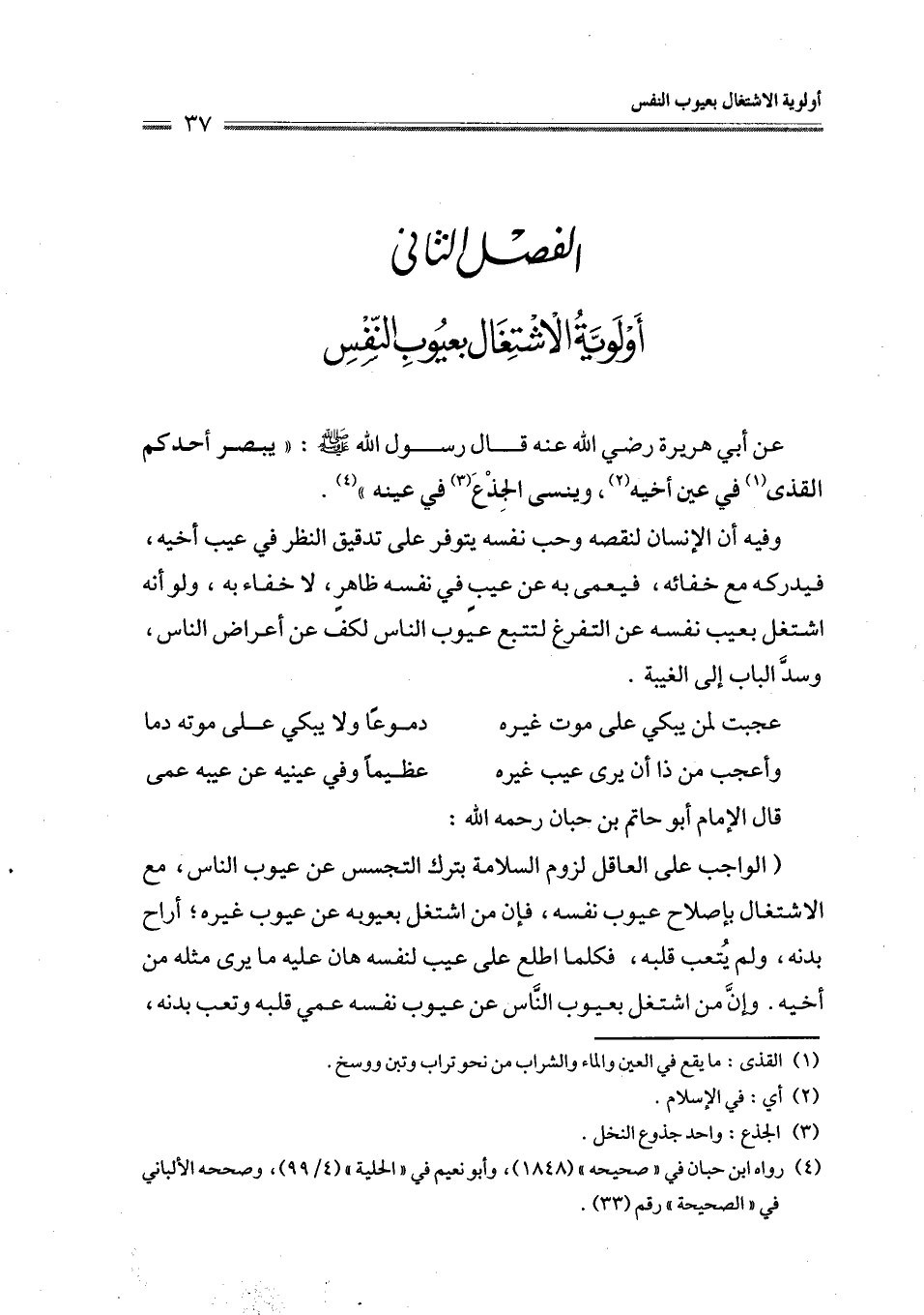 عن أبي هريرة رضي الله عنه قال رسول الله - صلى الله عليه وسلم -: " يبصر أحدكم القذى (¬1) في عين أخيه (¬2)، وينسى الجِذْعَ (¬3) في عينه " (¬4).